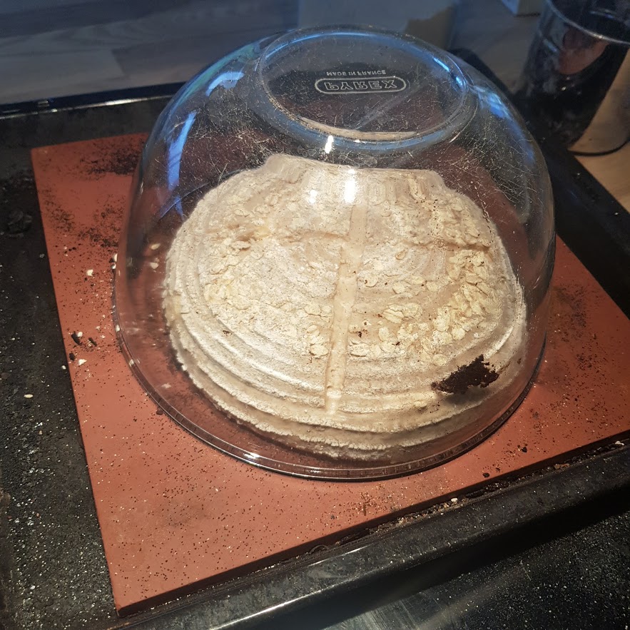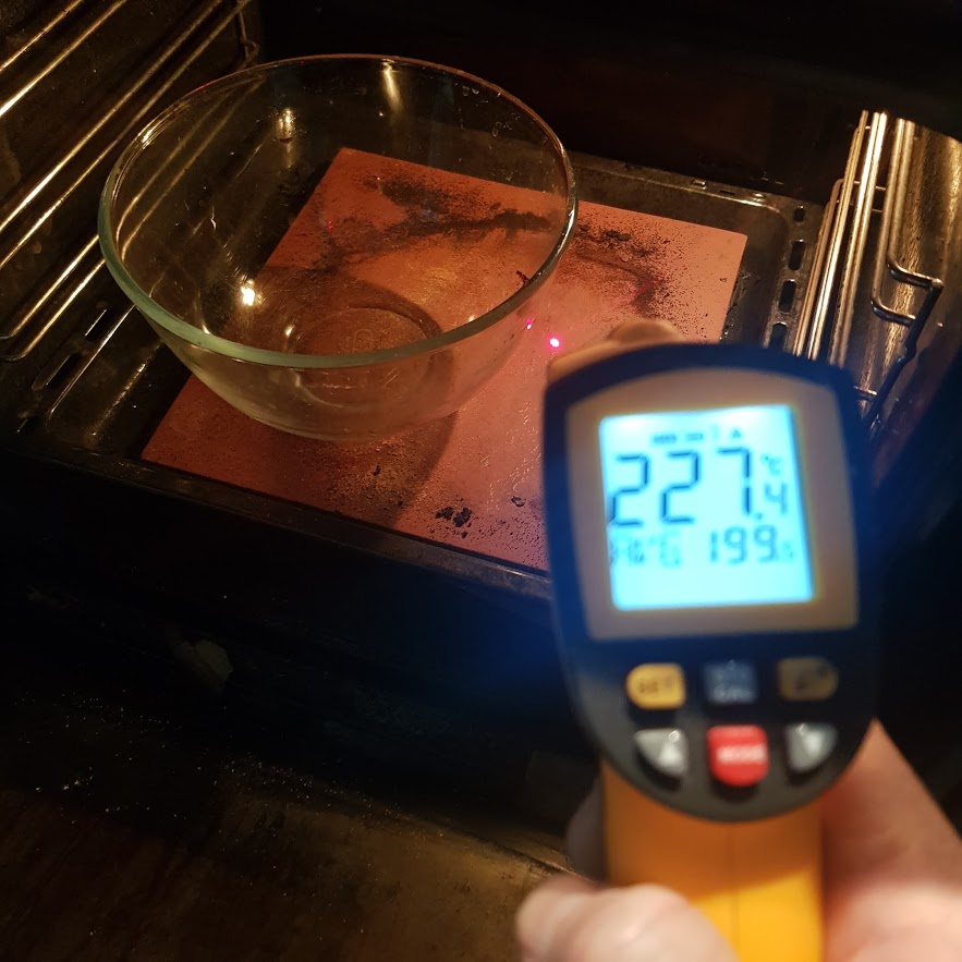 9:00am next morning i heated oven to max which turns out to be about 230c on the thermometer. Baking stone on the bottom rack with a pyrex bowl preheating.