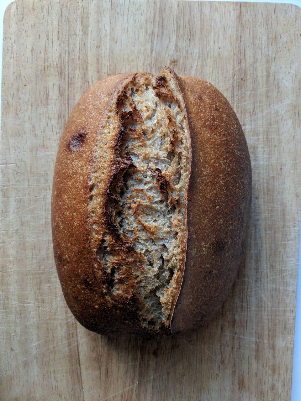 By using a much younger (3-5 hours old) levain, the dough seemed to go A LOT longer before ripping (if even). My new goal is to get a more shiny, open crumb; however, I'm guessing this more a matter of upping the hydration. Here's a loaf with the same "problematic" flour, a young levain, and 65% hydration: