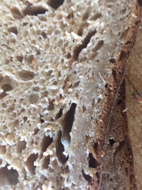 The crumb looks like it is falling or compacting above the bottom crust.  Why?  Overproofed or underdeveloped gluten matrix comes to mind.  Might be helpful to see the whole crust crumb shot.