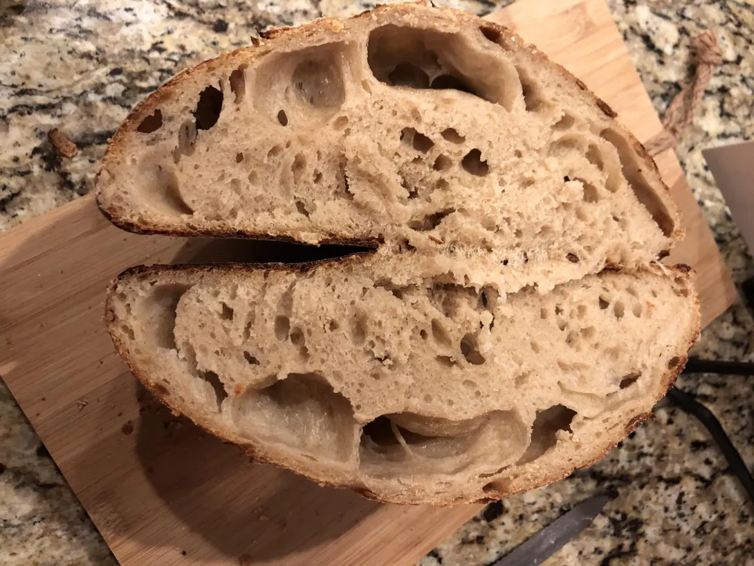 Why the big air bubbles at top? Also, it was slightly gummy/shiny inside. Does that mean it's over proofed or under cooked? And the crust was a little harder than I desire. Anything that can be done about that? Used Tartine country bread recipe as close as I could.