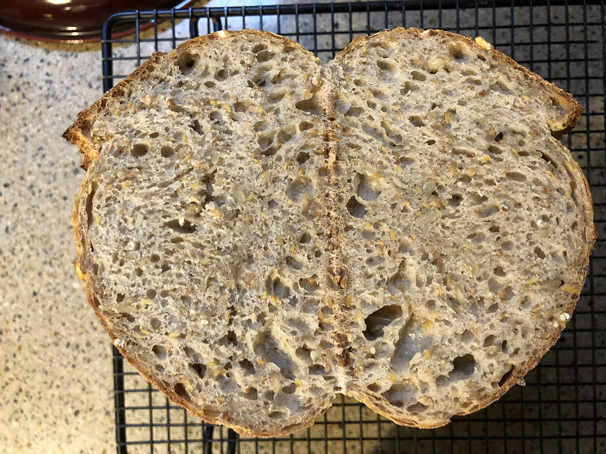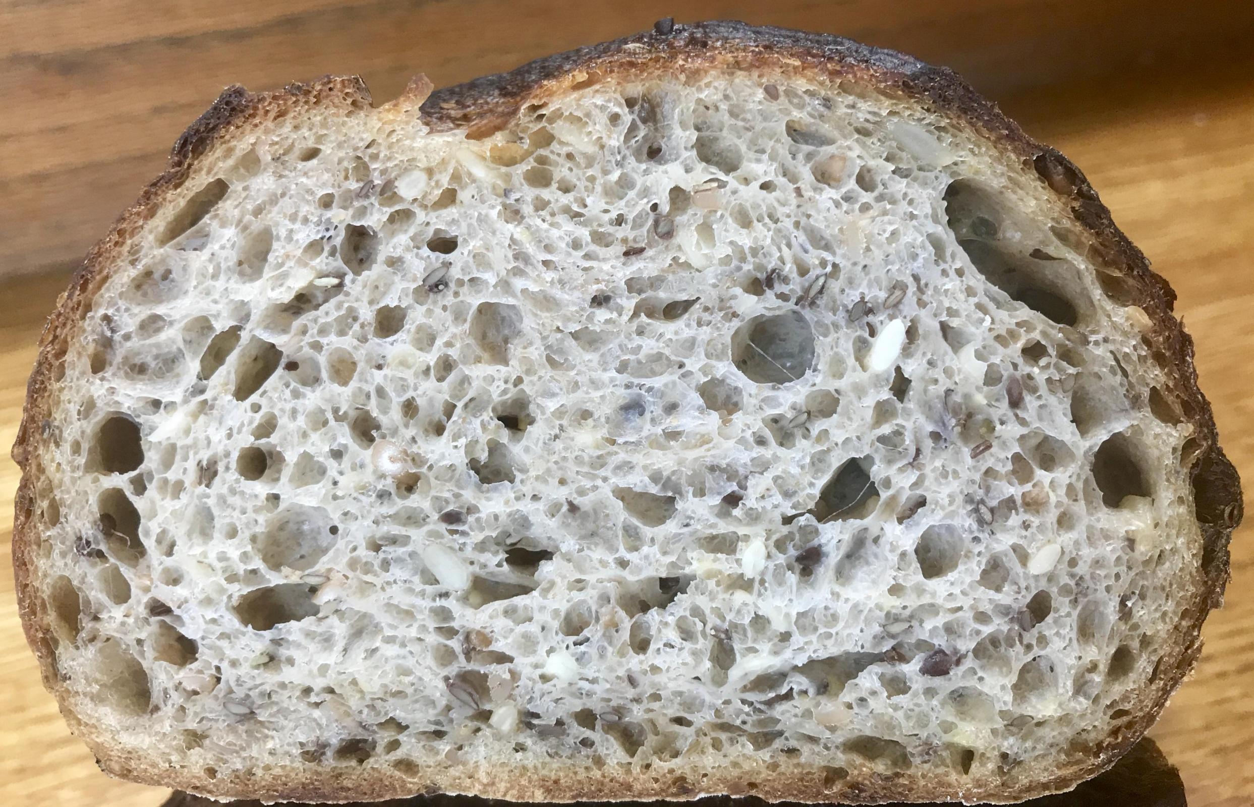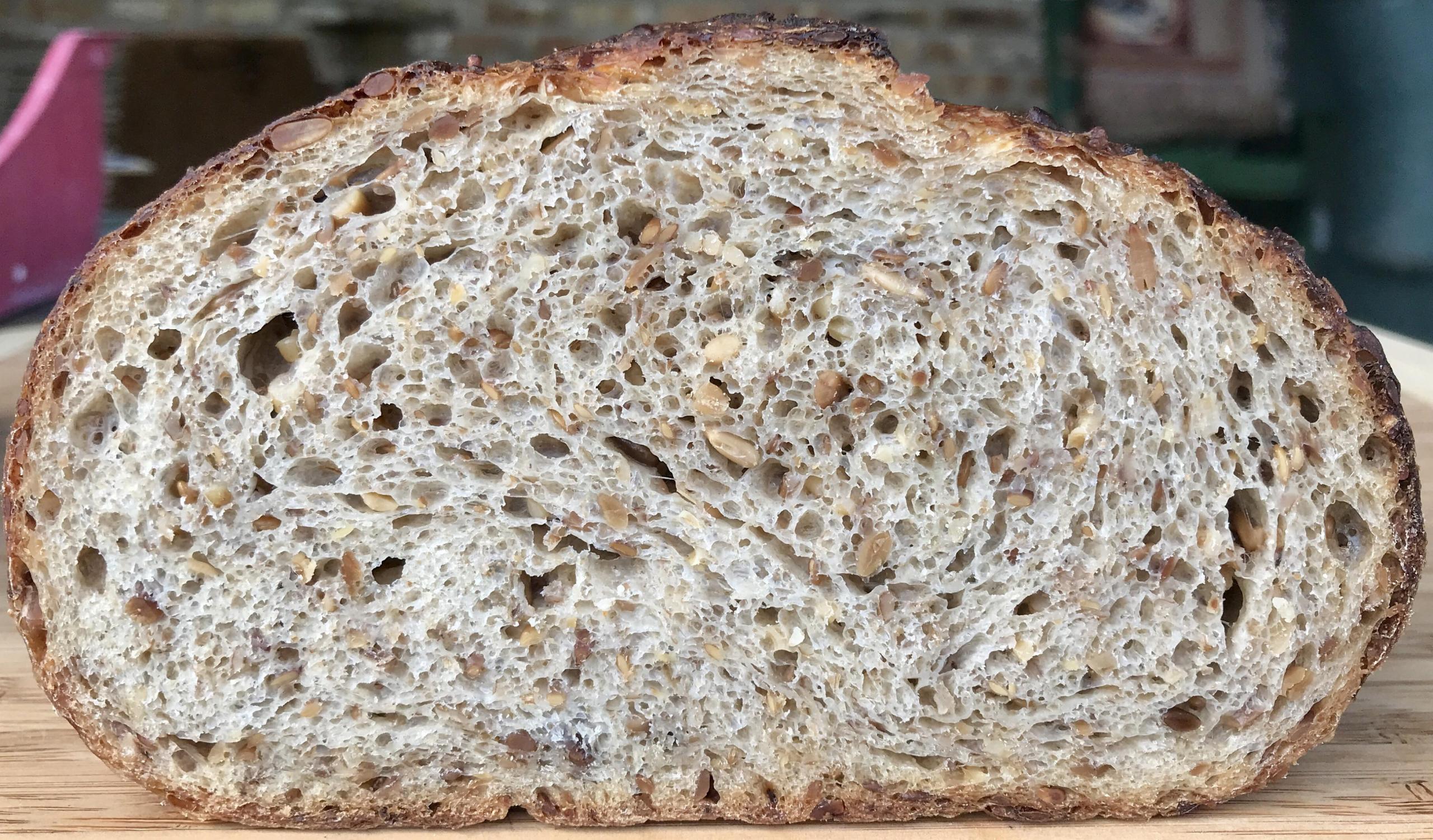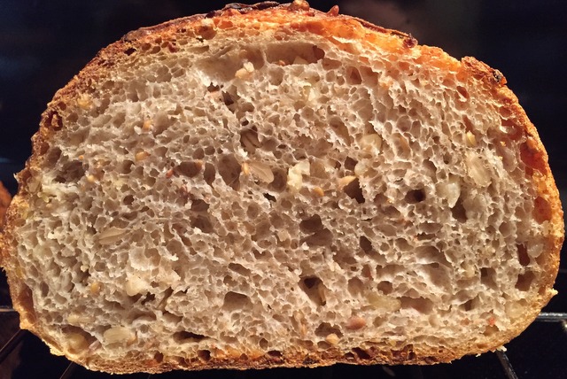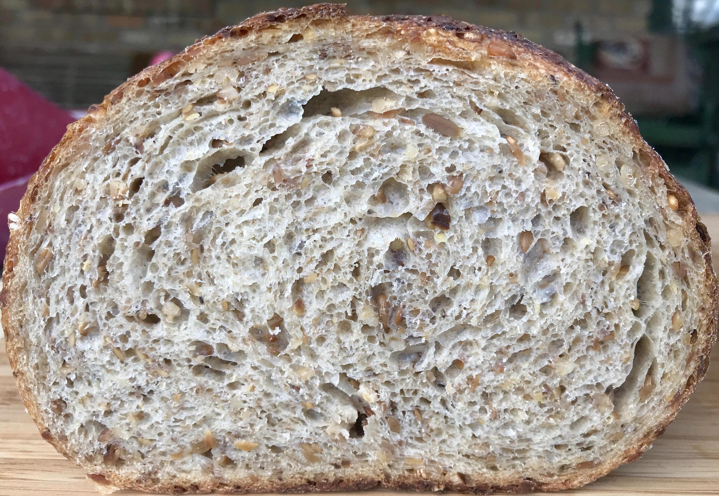 Here is my attempt,  I didn't have all the grains, so I substituted liberally, and forgot to add the salt to the soaker.  I almost never use anything but whole wheat, so it was a bit of a learning experience.  As to Dan and over mixing,  I have an older model DLX with 3 speed bars -  I followed the timing in Bread to the T - the low speed being one, and midway being two, and I don't think it was overmixed, if anything it was a little undermixed.  I then misread the bulk ferment instructions  ( again I was reading from the book, not the instructions here) and forgot to stretch and fold mid way through the bulk ferment. I did a stretch and fold near the end, and it showed good strength.  In the end, it came out  fine, though I am sure the taste would be much improved if I had the grains called for.