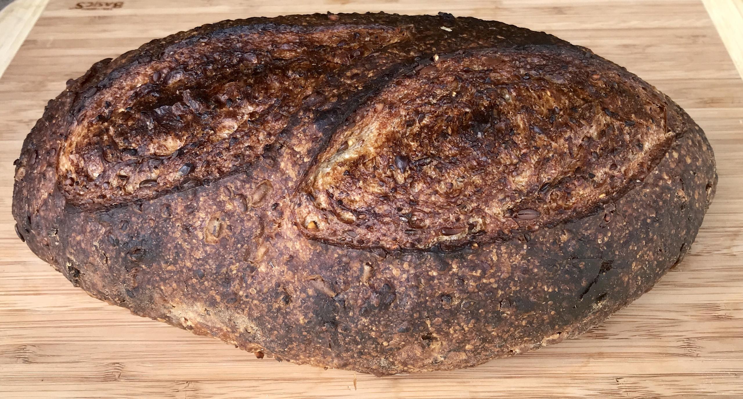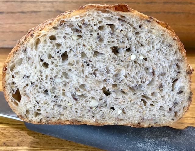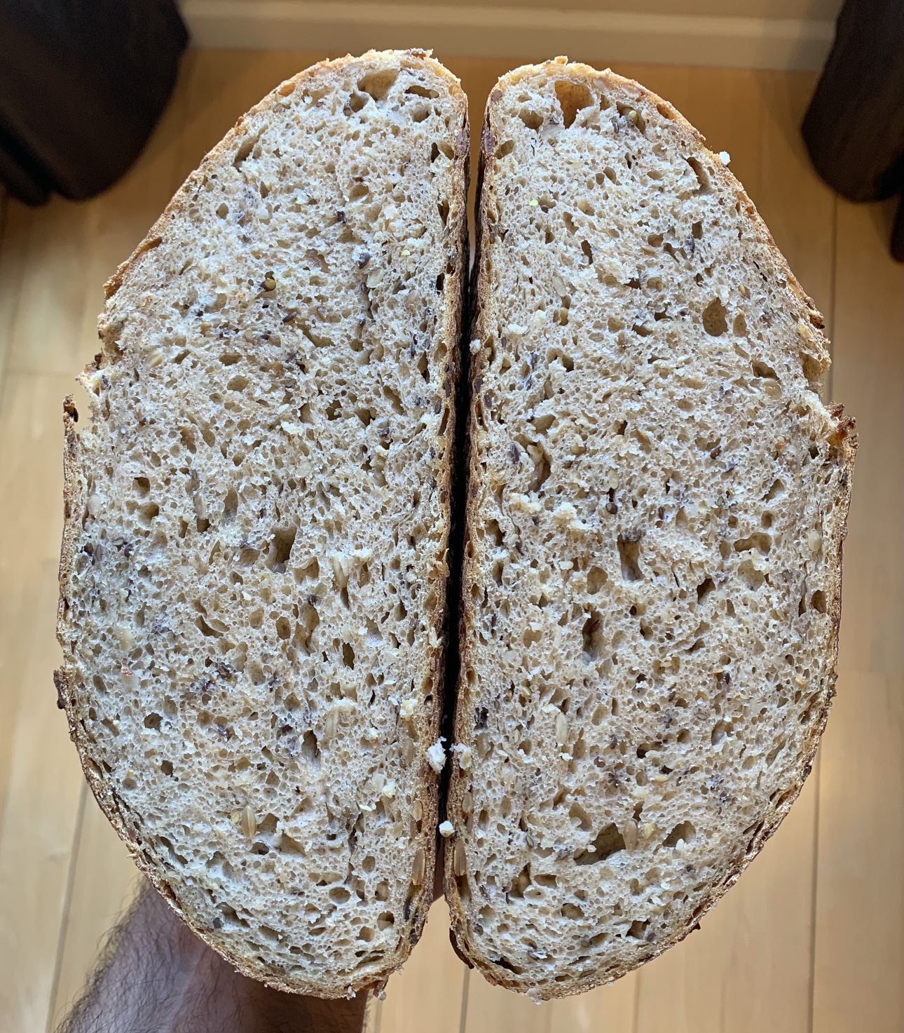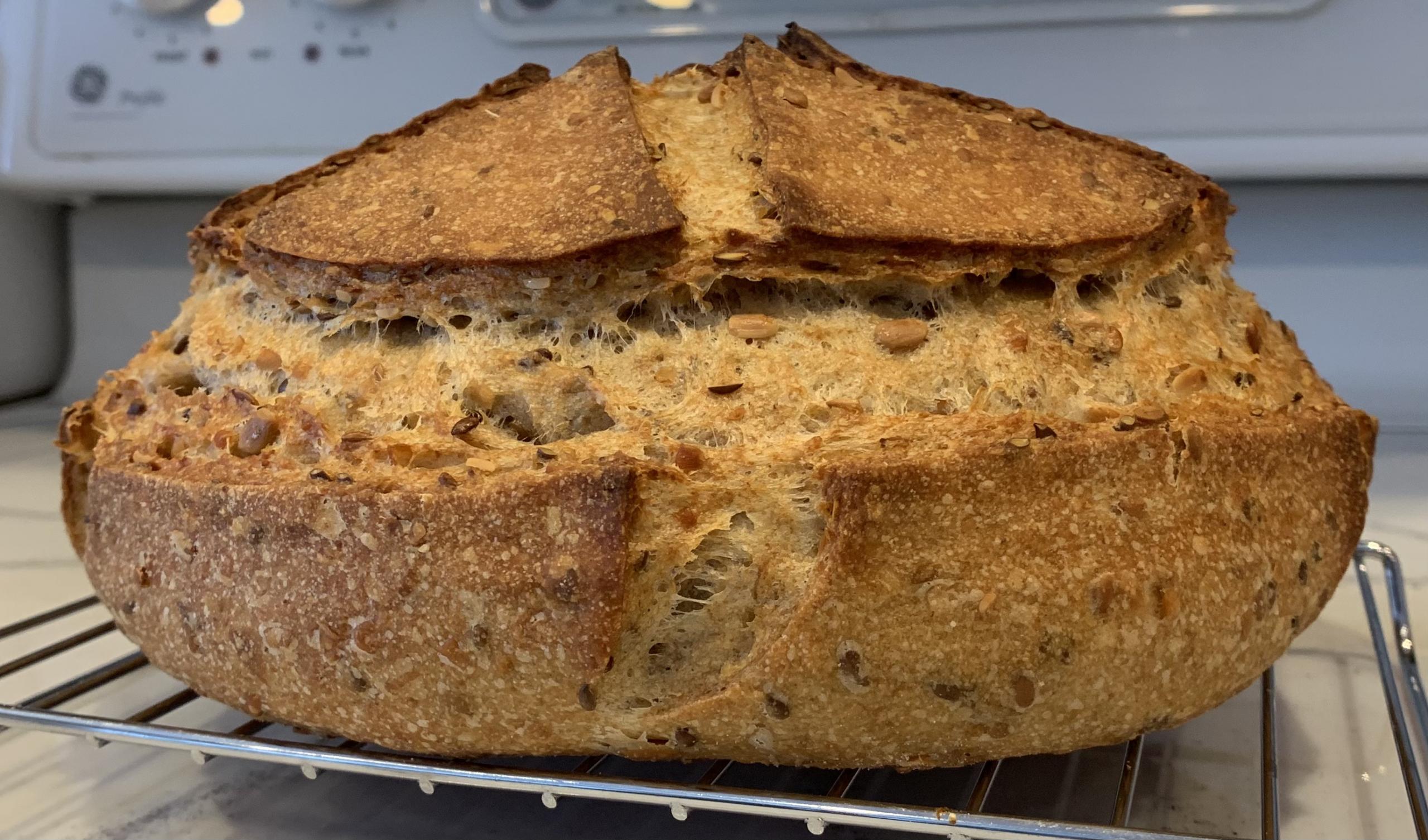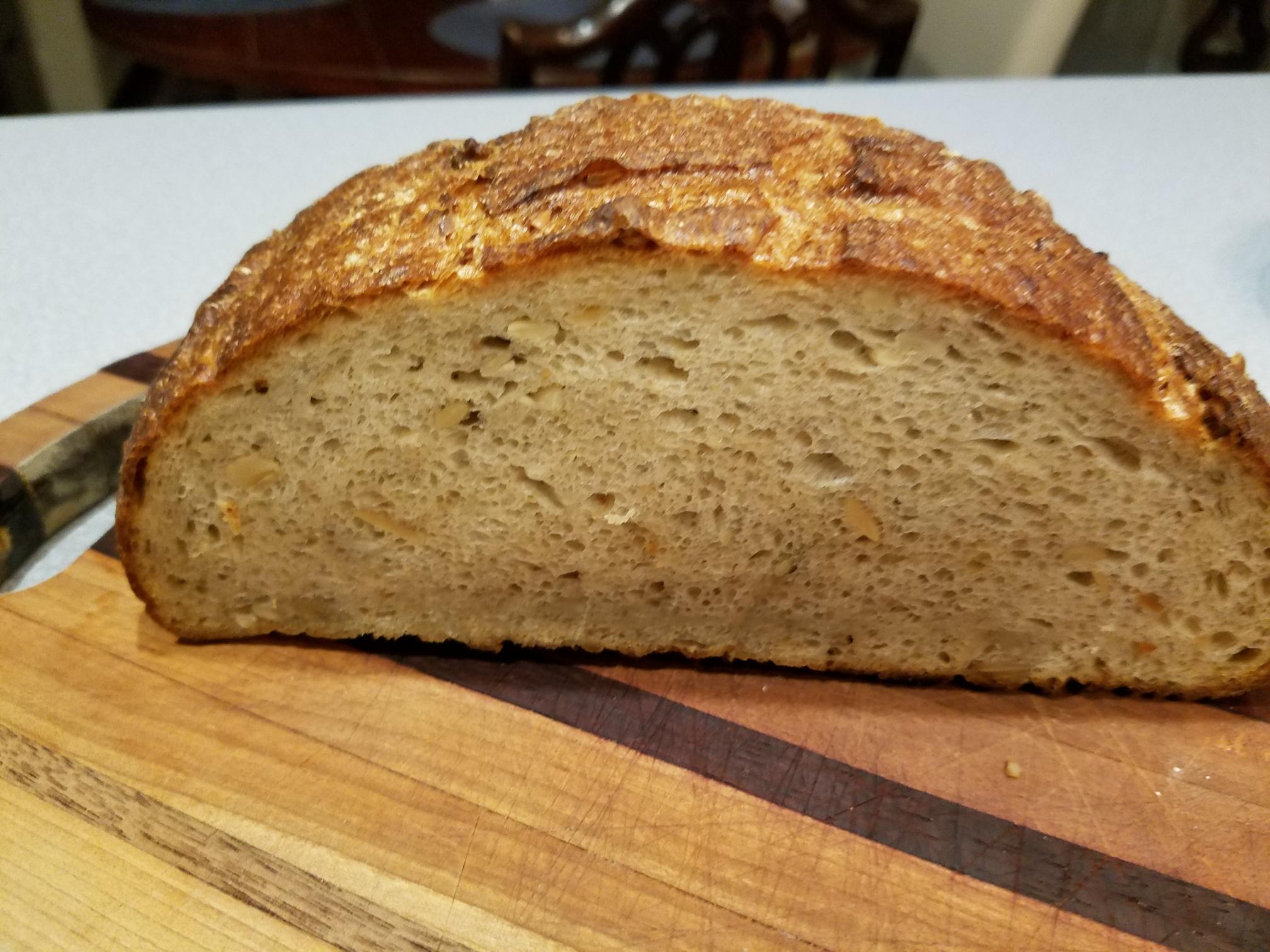 Here is my attempt,  I didn't have all the grains, so I substituted liberally, and forgot to add the salt to the soaker.  I almost never use anything but whole wheat, so it was a bit of a learning experience.  As to Dan and over mixing,  I have an older model DLX with 3 speed bars -  I followed the timing in Bread to the T - the low speed being one, and midway being two, and I don't think it was overmixed, if anything it was a little undermixed.  I then misread the bulk ferment instructions  ( again I was reading from the book, not the instructions here) and forgot to stretch and fold mid way through the bulk ferment. I did a stretch and fold near the end, and it showed good strength.  In the end, it came out  fine, though I am sure the taste would be much improved if I had the grains called for.