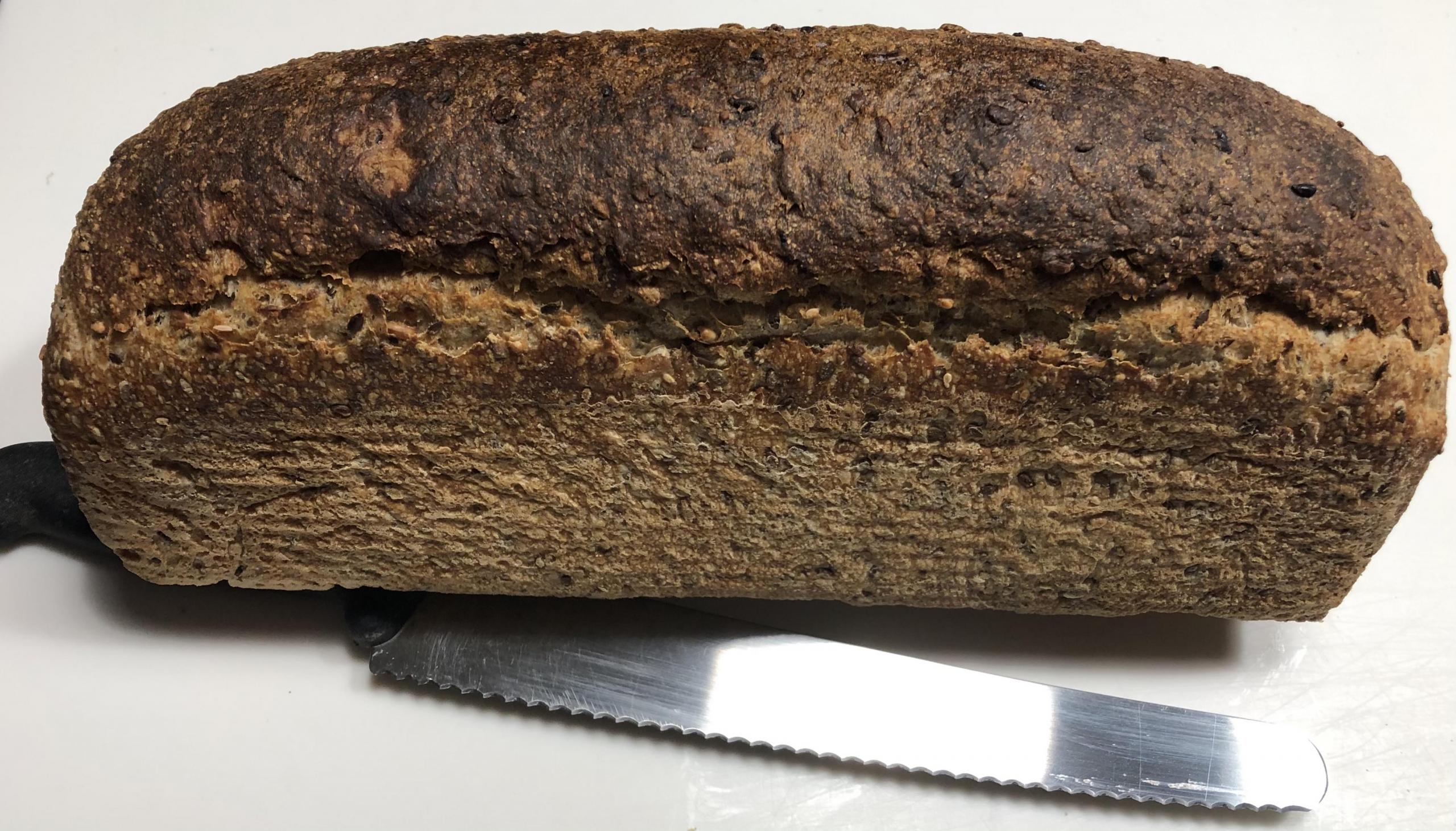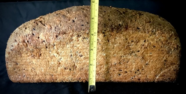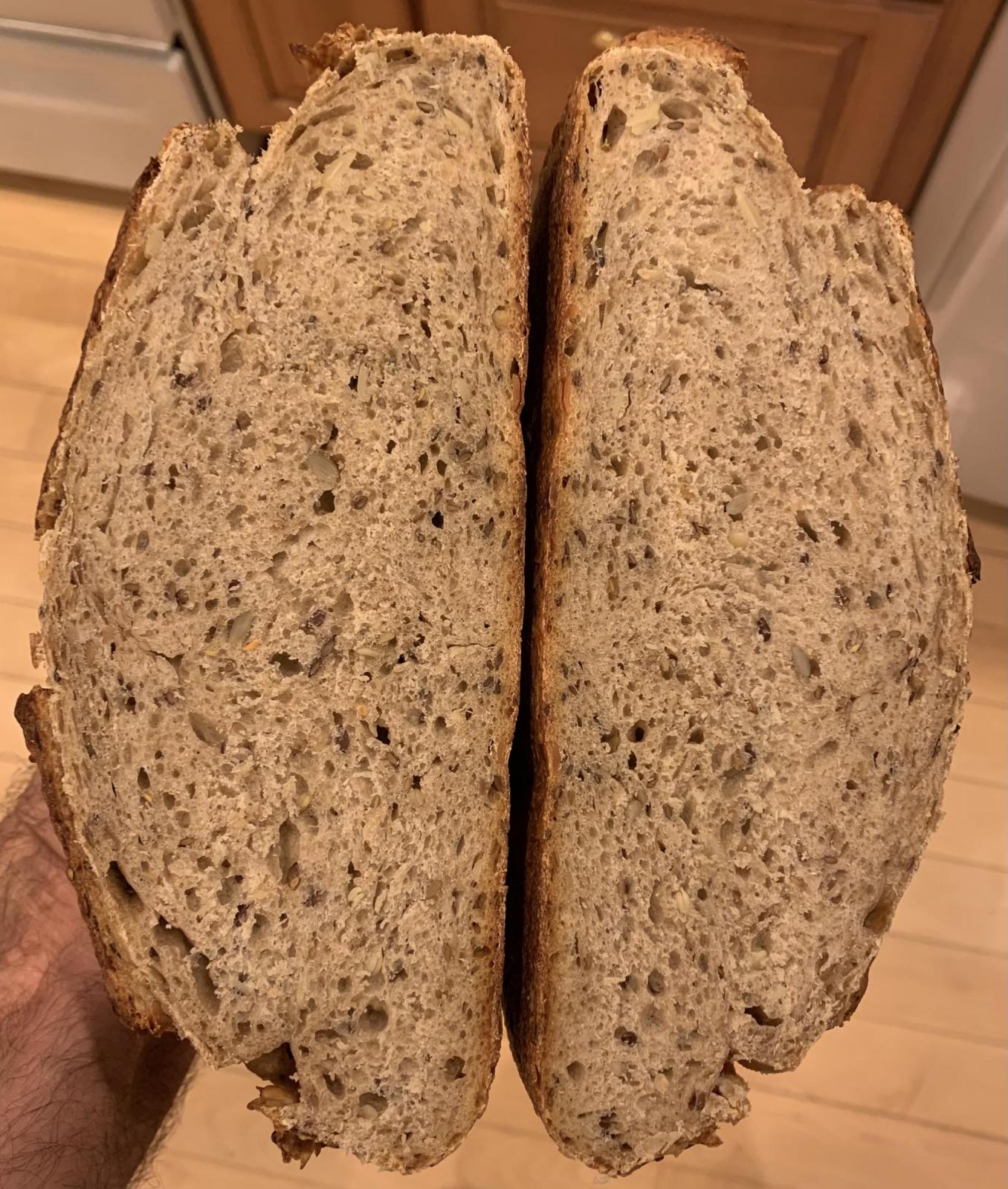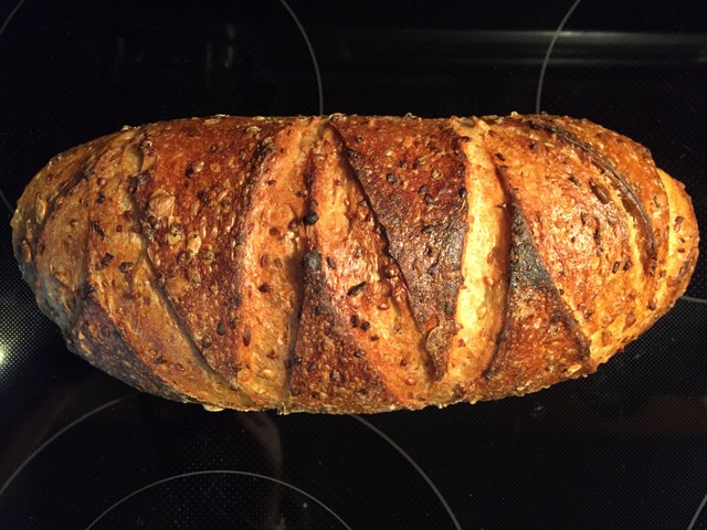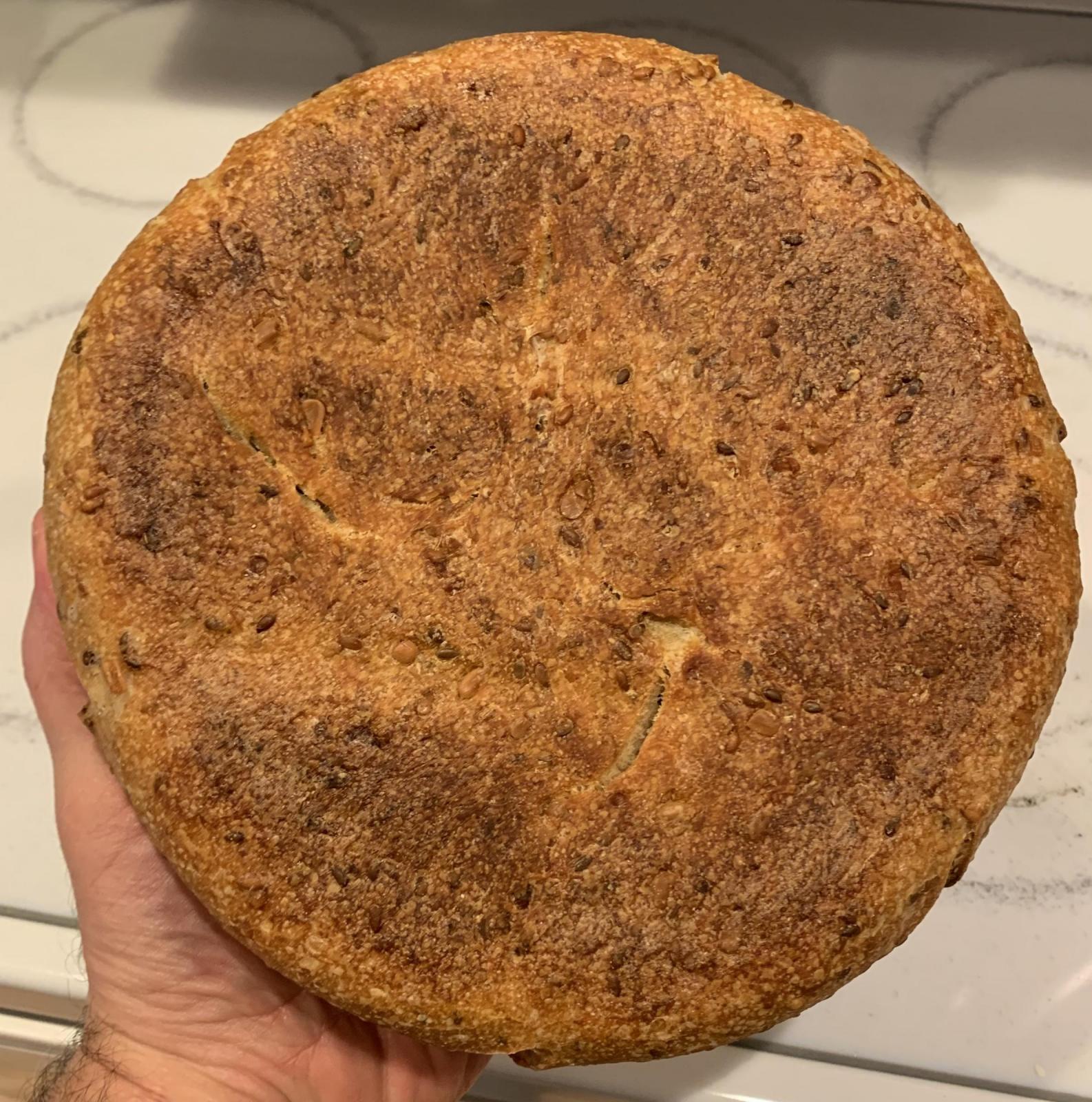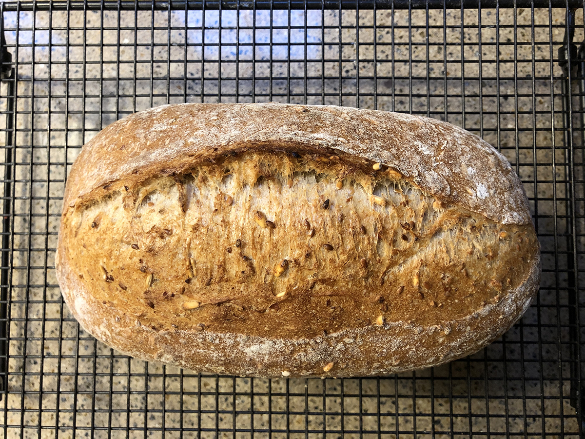 Here is my attempt,  I didn't have all the grains, so I substituted liberally, and forgot to add the salt to the soaker.  I almost never use anything but whole wheat, so it was a bit of a learning experience.  As to Dan and over mixing,  I have an older model DLX with 3 speed bars -  I followed the timing in Bread to the T - the low speed being one, and midway being two, and I don't think it was overmixed, if anything it was a little undermixed.  I then misread the bulk ferment instructions  ( again I was reading from the book, not the instructions here) and forgot to stretch and fold mid way through the bulk ferment. I did a stretch and fold near the end, and it showed good strength.  In the end, it came out  fine, though I am sure the taste would be much improved if I had the grains called for.