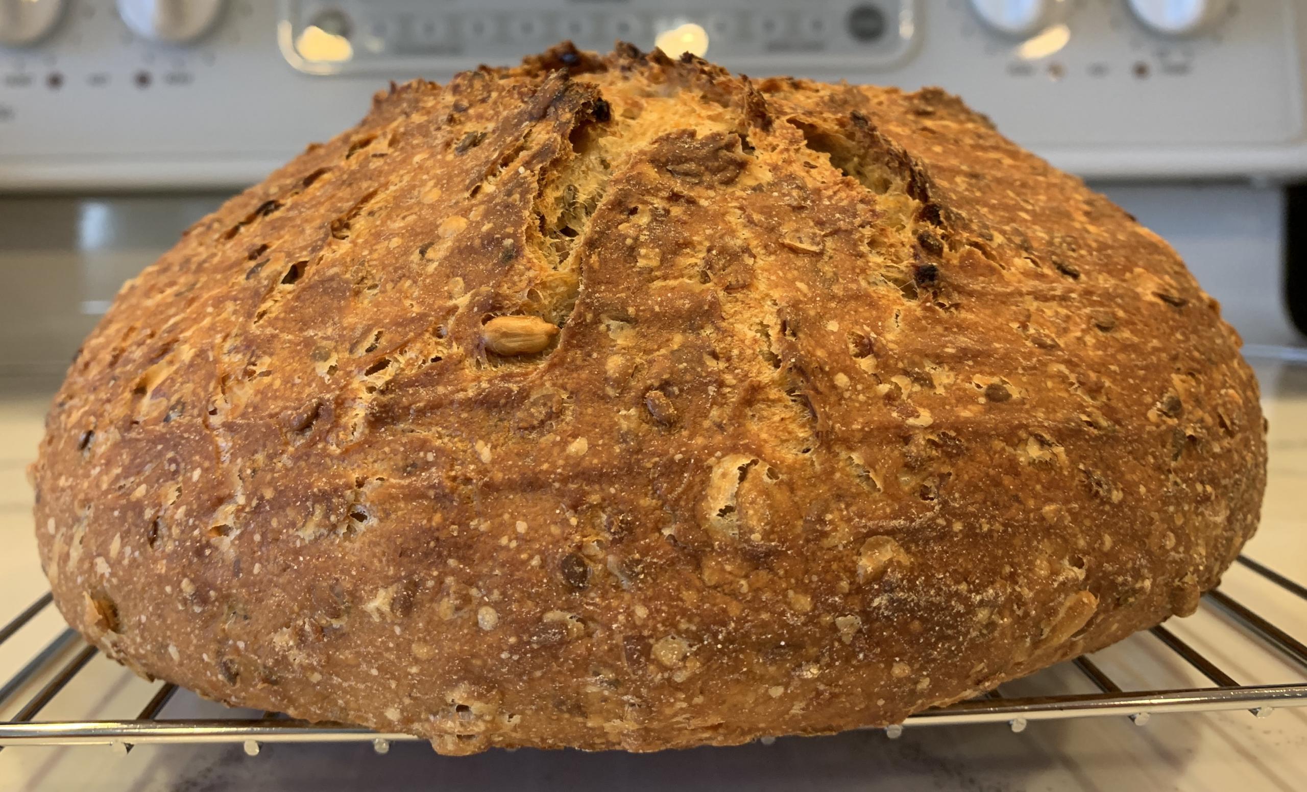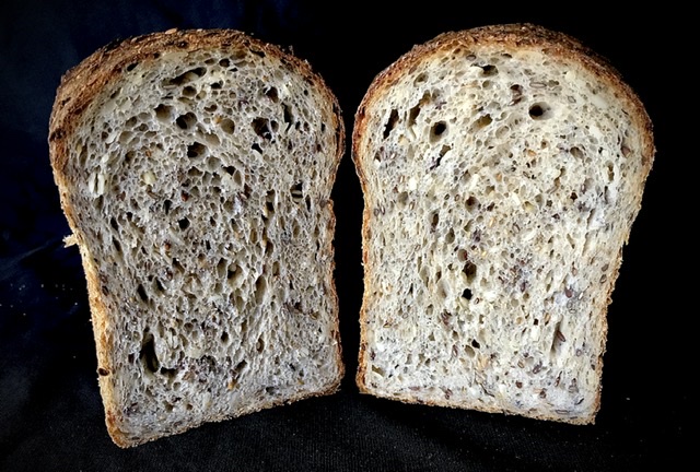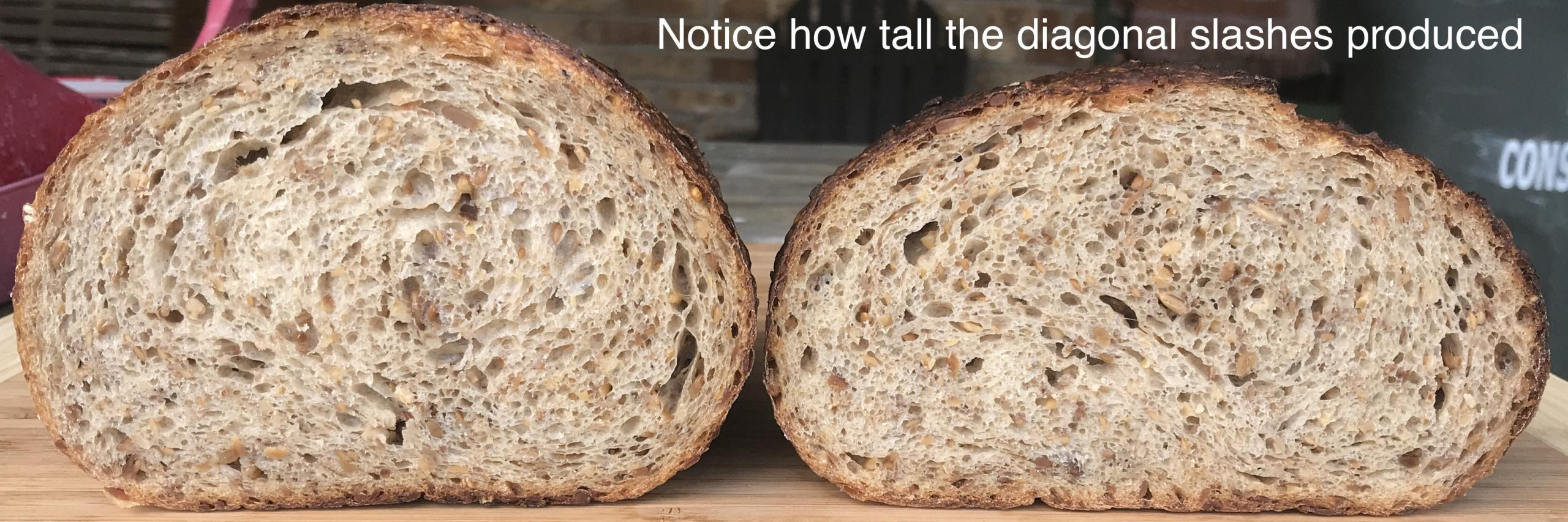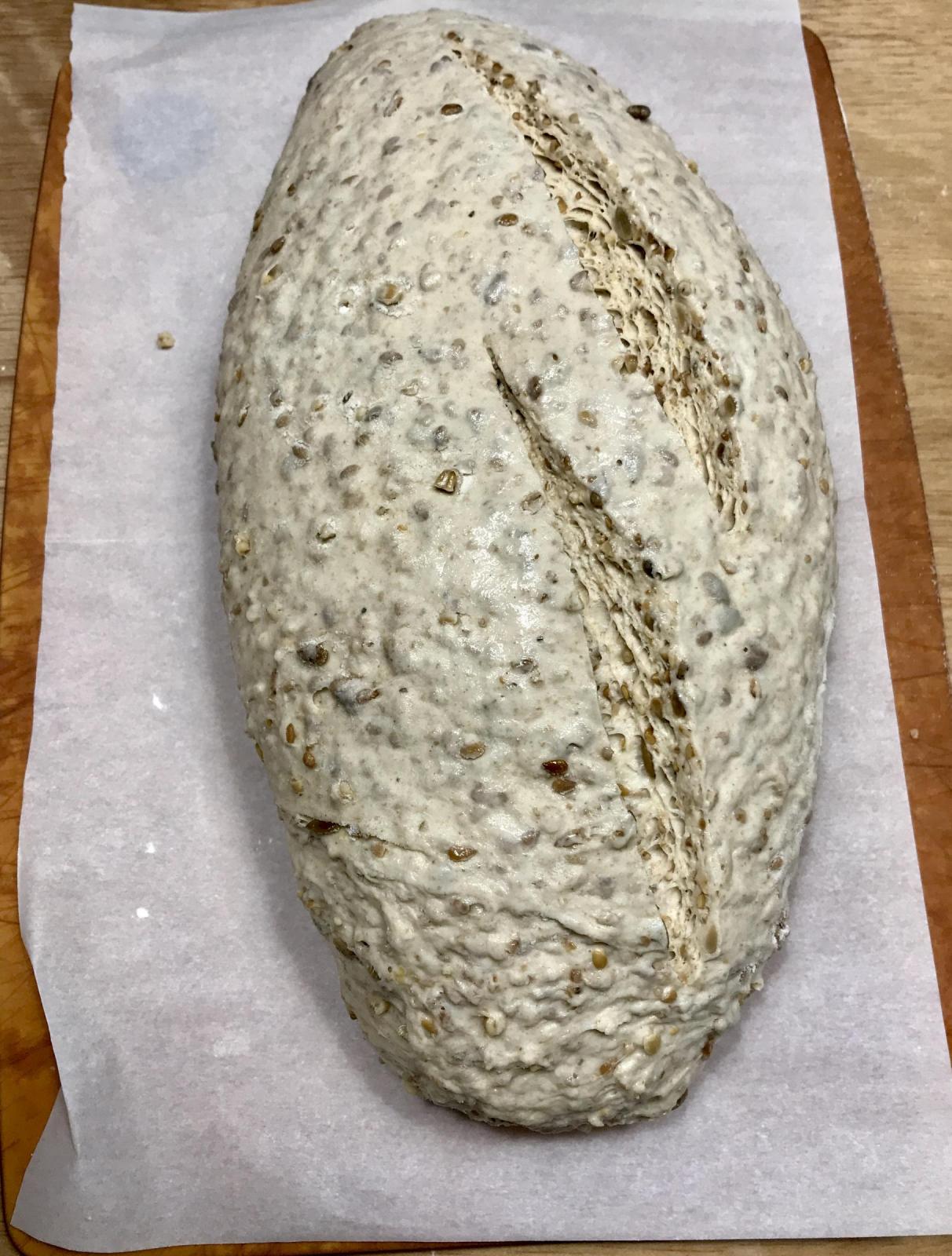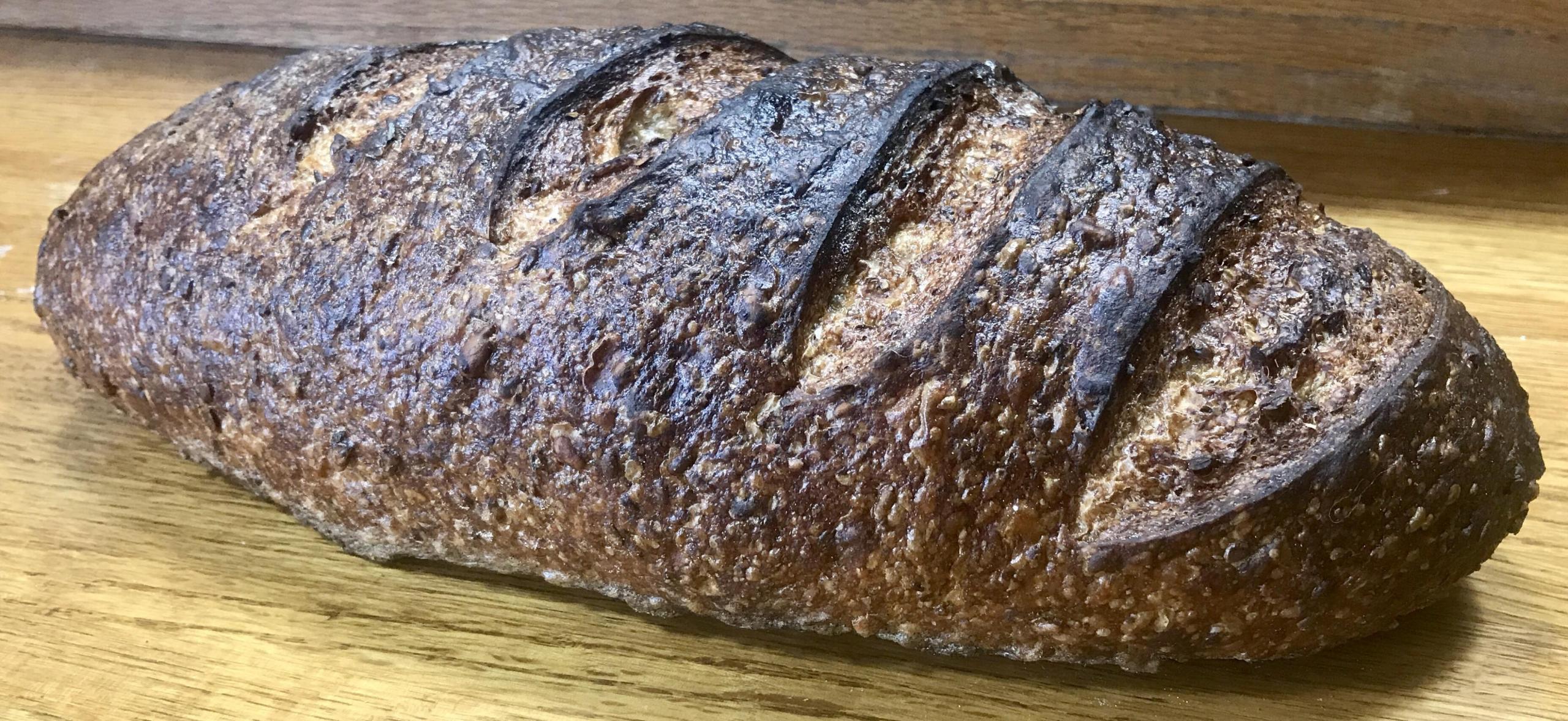 Here is my attempt,  I didn't have all the grains, so I substituted liberally, and forgot to add the salt to the soaker.  I almost never use anything but whole wheat, so it was a bit of a learning experience.  As to Dan and over mixing,  I have an older model DLX with 3 speed bars -  I followed the timing in Bread to the T - the low speed being one, and midway being two, and I don't think it was overmixed, if anything it was a little undermixed.  I then misread the bulk ferment instructions  ( again I was reading from the book, not the instructions here) and forgot to stretch and fold mid way through the bulk ferment. I did a stretch and fold near the end, and it showed good strength.  In the end, it came out  fine, though I am sure the taste would be much improved if I had the grains called for.