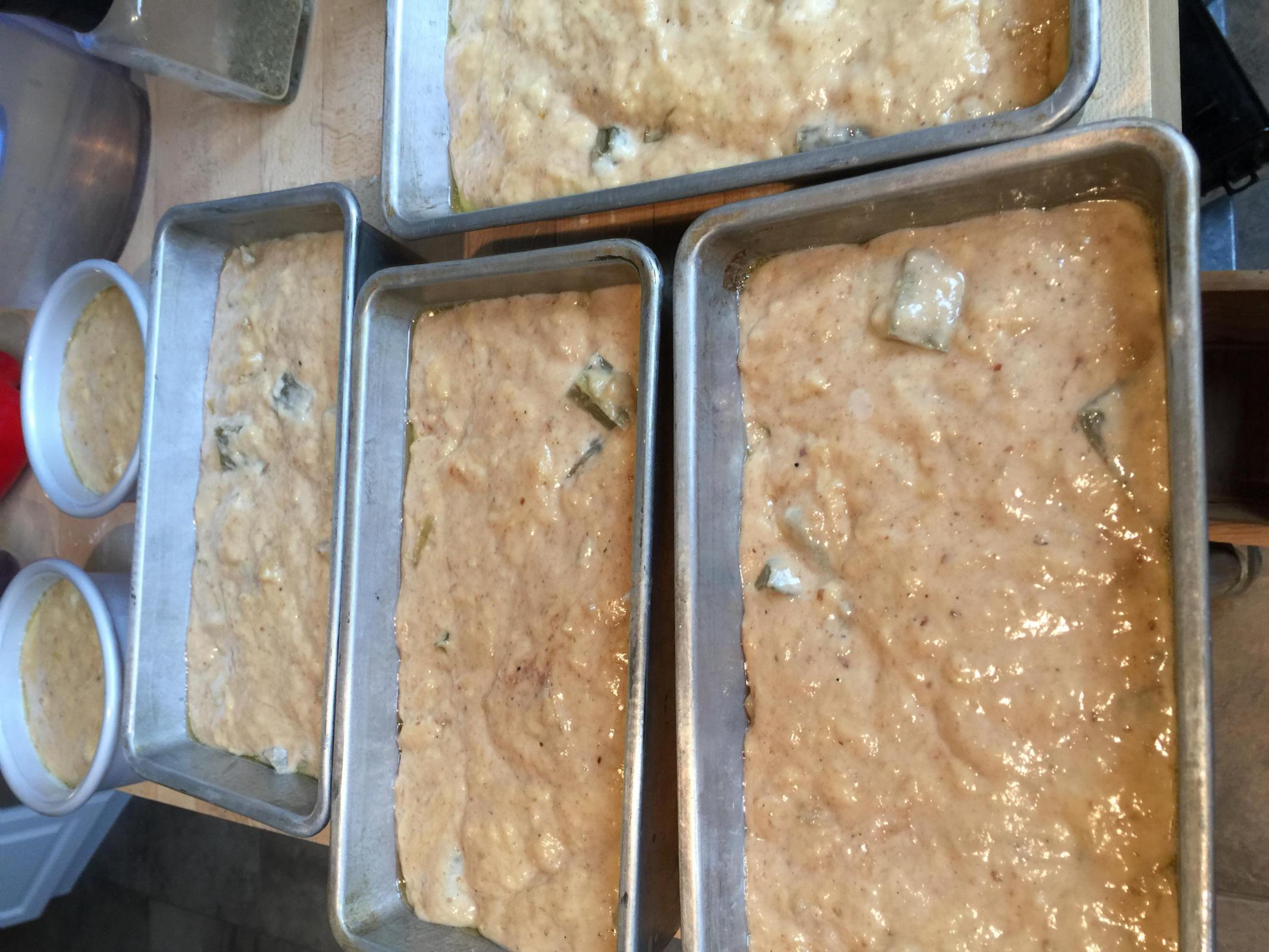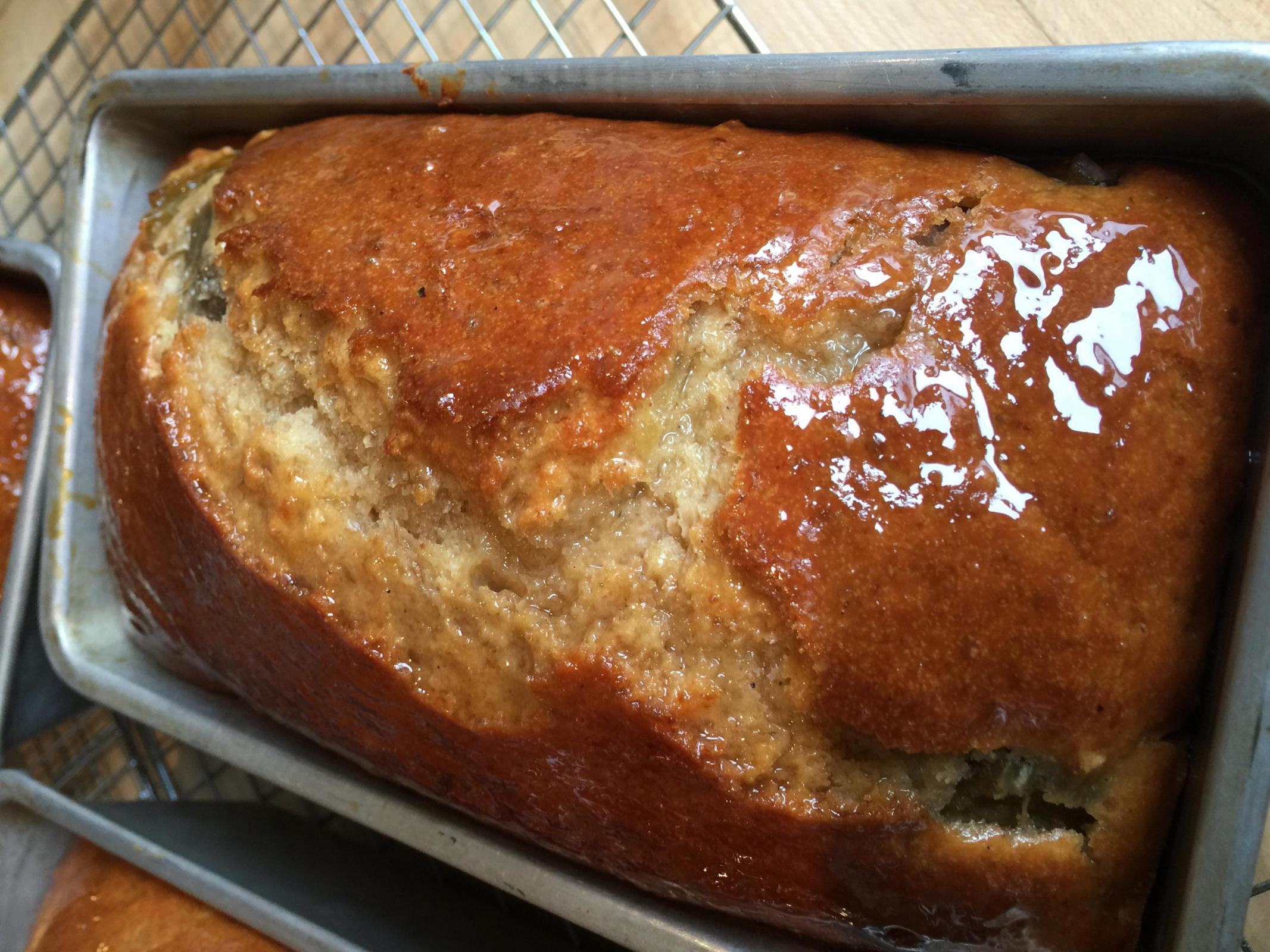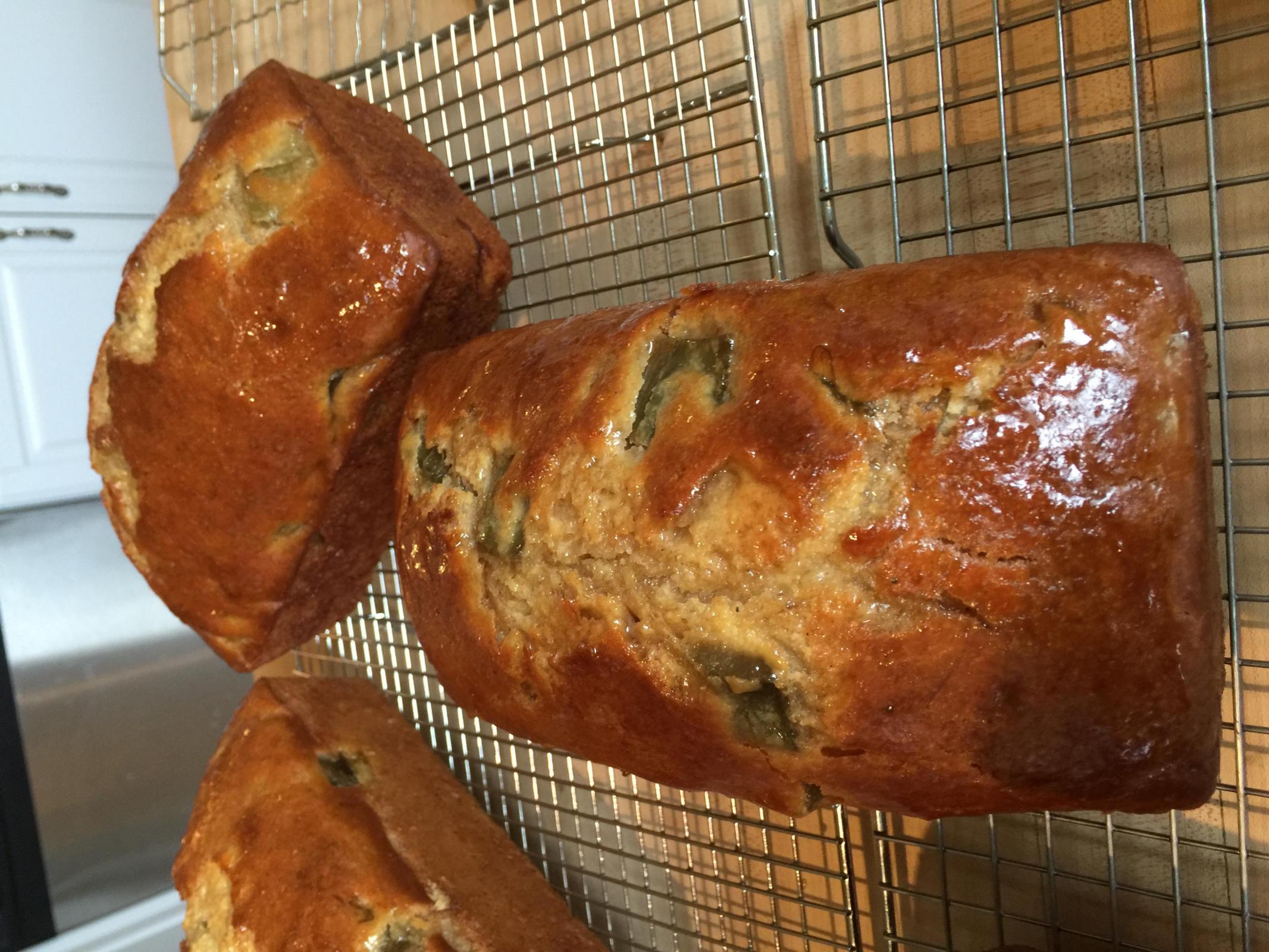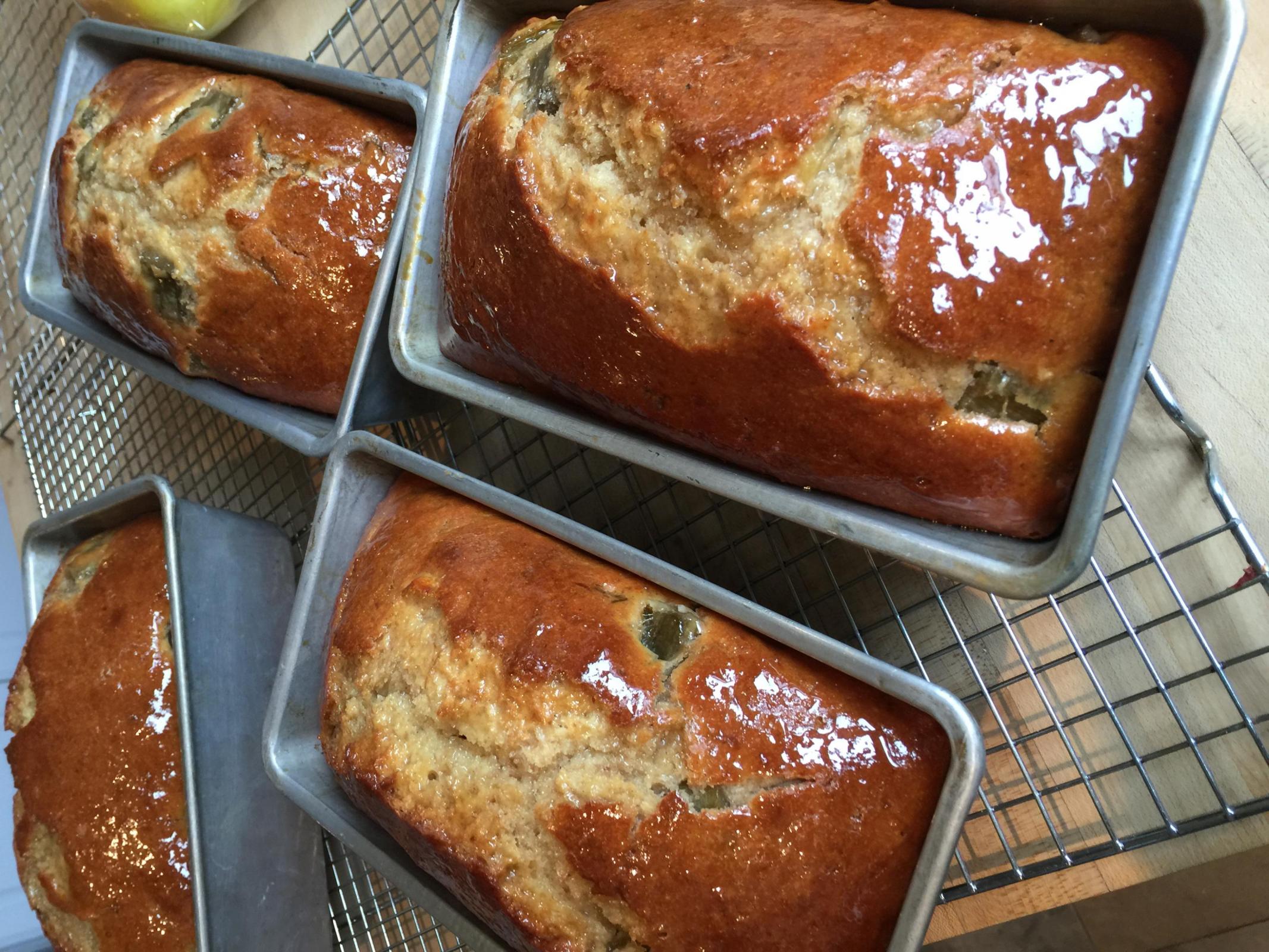 This is the most amazing bread I have ever created. I used a banana bread recipe for the base. The original is on Perfect Sourdough Teresa L Greenway’s Facebook site. I had previously made her formula. In an effort to clear out my pantry I decided to incorporate new fruits but keep the other essentially the same. I have canned green Victoria rhubarb from a friend in Wisconsin. I used applesauce that I made from wild apples I picked. I created enough bubbly levain to double the formula making 4– 8x4 loaf pans. The original recipe as published by Teresa calls for discard. I don’t keep any so I made 740 g of bubbly levain!! I drained the rhubarb and boiled the syrup down and basted the hot loaves with it. The flavorings are cardamom and diced candied ginger. All I can say is wow! Amazing. I leave this batter to rise in a warm place for 2 hrs. I find it really makes a wonderful difference in the breads texture. You can see the incredible oven spring. If you join/search Perfect Sourdough you can see the post and get the links for the details.