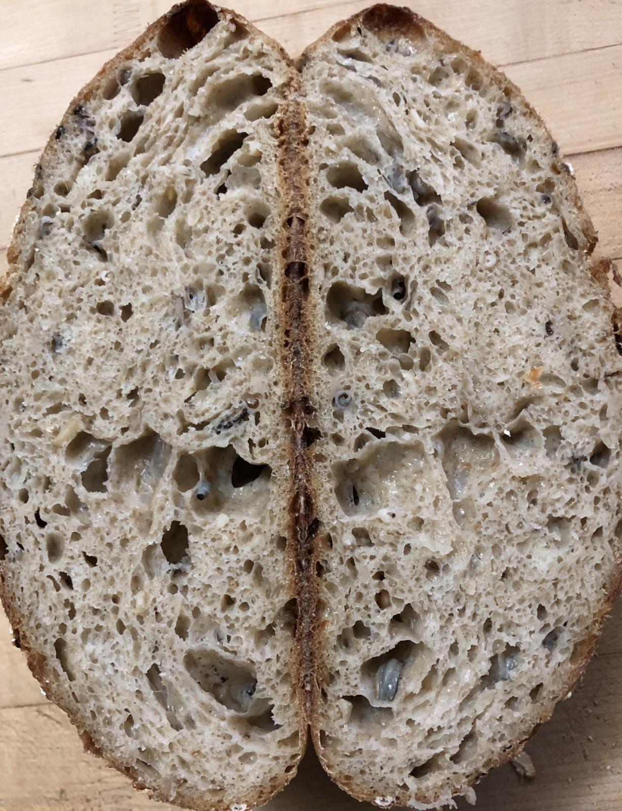 I am blaming the high hydration for the lack of explosive oven spring, but I have another loaf in the oven that I made with the leftover Levain as well as lower hydration and it also has similar oven spring! Maybe it’s the starter or they overproofed slightly. ?