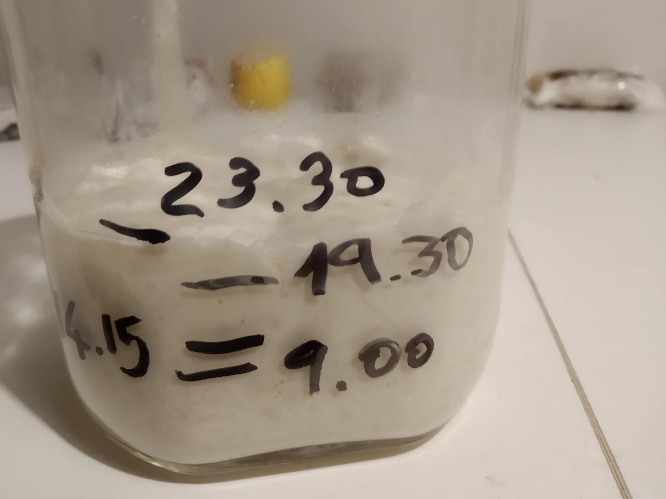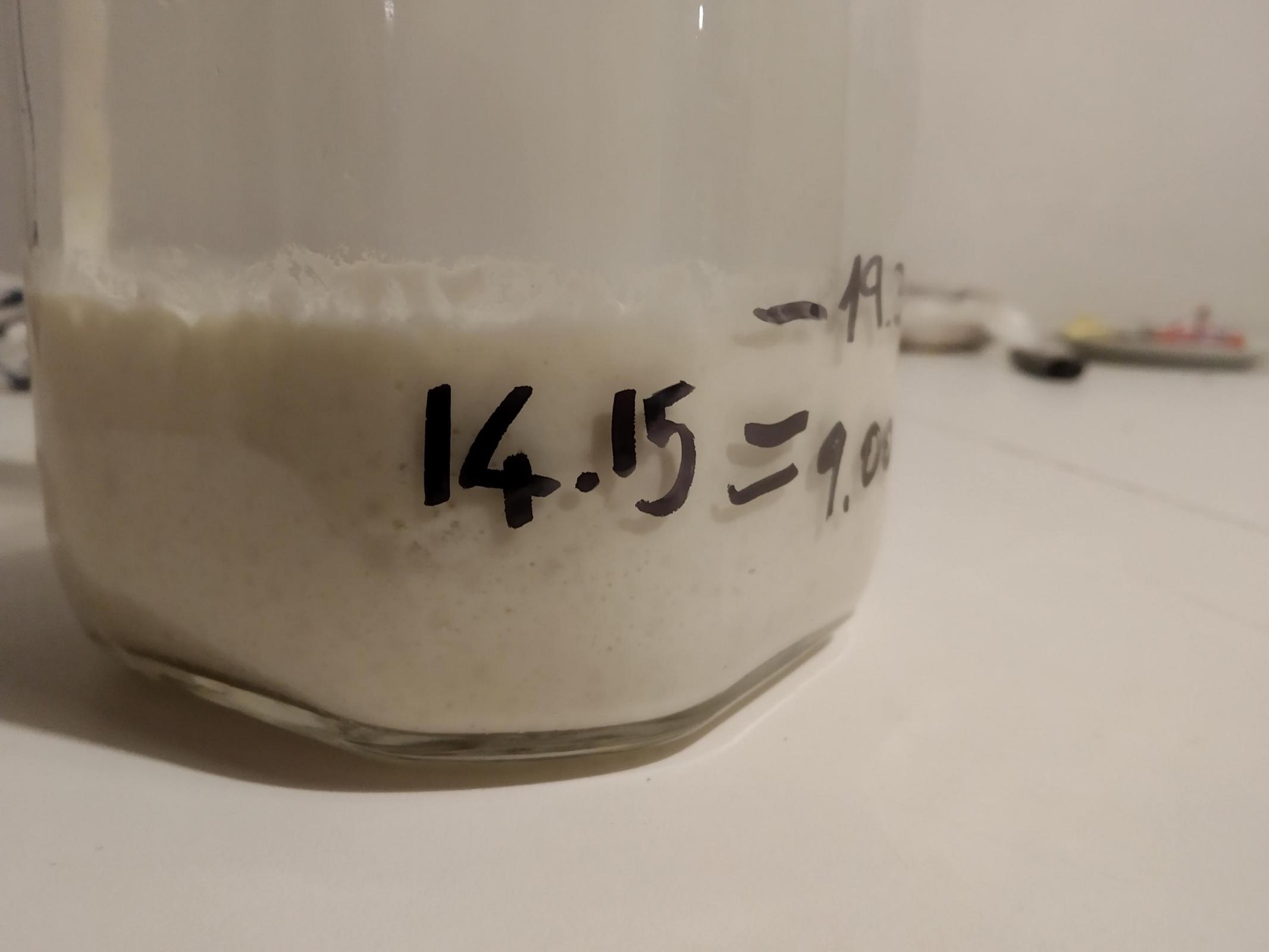 I'm trying to follow the txfarmer's recipe for poolish croissant. So, having done croissants a few times before but never had the chance to try preferments I decided to do some tests. I mixex 130g of water with 130g of strong flour (w350) and 0.5 grams of fresh baker's yeast. I wanted to see how long would the poolish take to be ready. Here you can see two pictures that show how the level of the polish rises in the first 8 hours, then it lowers a bit (you can see the mark left by the poolish) and then at 19.30 it starts rising again. So my question is when should I consider the poolish to be ready? My guess would be just when it's starting to go down for the first time. Is that correct?