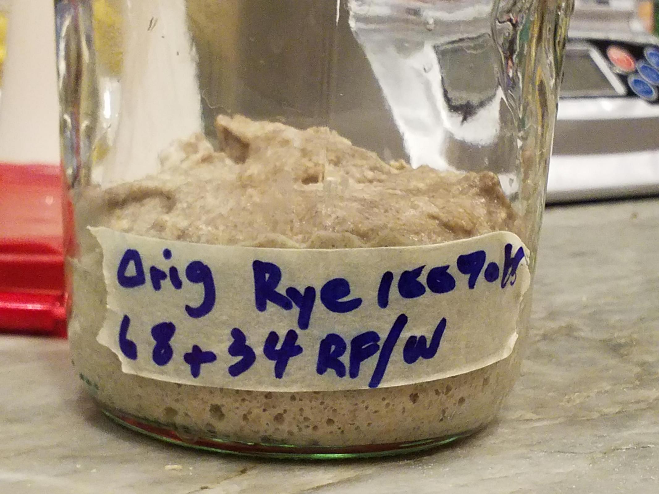 1. Dark rye starter: 4 weeks old.  Has lived in the oven with the light on. Temps not kept at 74°F. But, now I have a folding proofing box that is set at 74°F. It has been in the proofing box for 2 days. When feeding, I keep 68g of starter and mix it with 34g dark rye flour and 34g filtered water (cold water out of my filtered faucet...not warmed...should I warm it? )  I feed once per day at 9:00 a.m.. The photo shows how little it rose from 9:00 a.m. to when I took the picture at 3:15 p.m. The top of the tape is the top of the starter after I fed it. It was doubling within 3-4 hours when it was in the oven, but now it is in the proofing box. I am guessing too much warmth made the starter double too quickly in the oven.