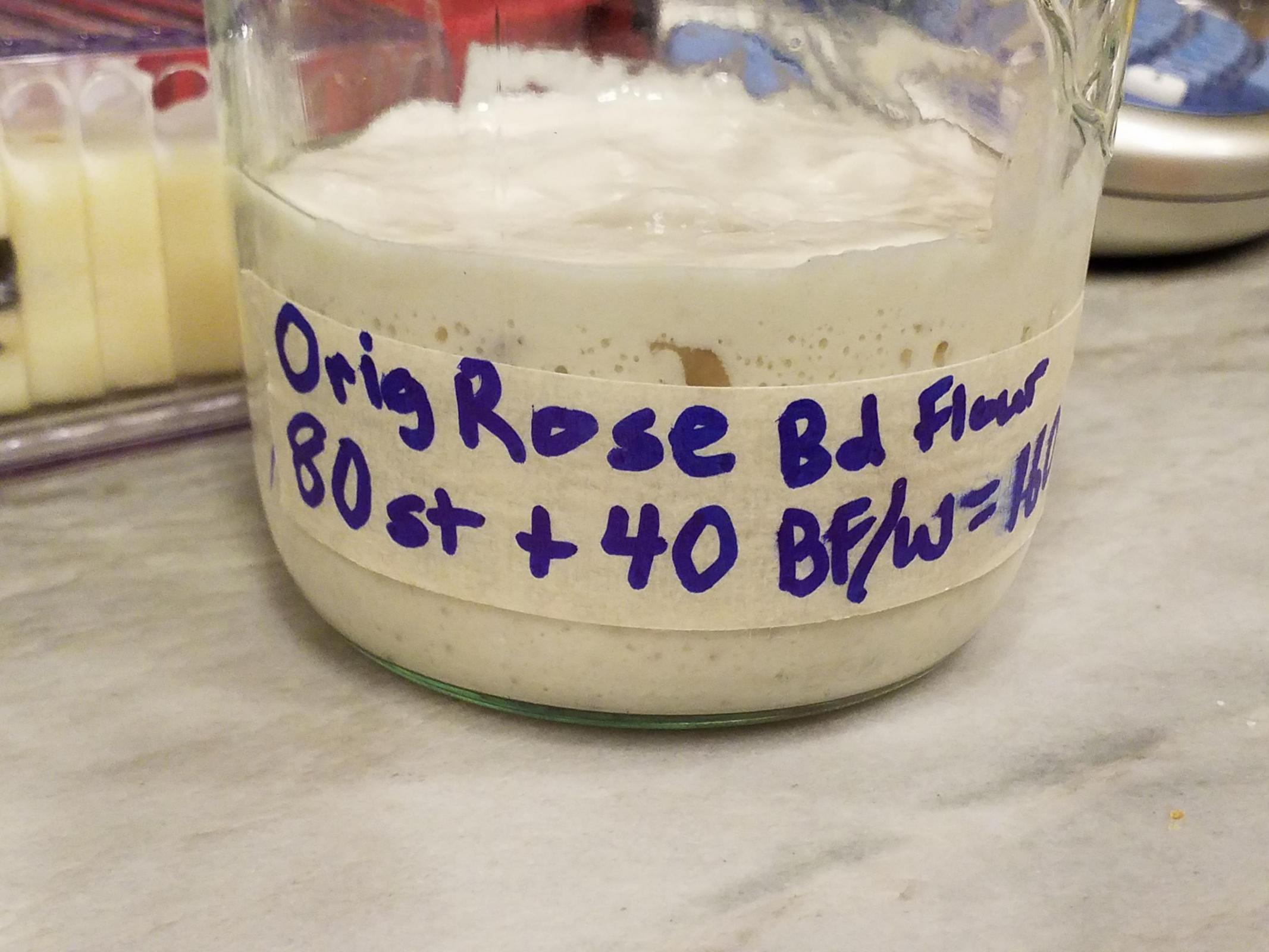 2.  A bread flour starter (Rose L B), also 4 weeks old, which was fed with dark rye for 2 days, then switched to bread flour by her recipe.  I think I was under feeding it because it said "feed equal parts water and flour", but I did not know (or didn't remember) how much starter to use. I just picked an amount and discarded the rest. I thought I had to make the water and flour weights equal the weight of the starter.  80g starter which gets fed 40g bread flour and 40g filtered cold water. This one has been kept in the refrigerator for 3 weeks. The first 2 weeks of refrigeration, I fed the 80g starter with 40g flour and 40g water 3 times per week and let it sit on the counter for 2 hours before refrigerating it. On the 3rd and 4th week, I fed it only once per week the exact same amounts.  The top of the tape shows where the top of the starter was after it was fed last Saturday, so you can see it does rise. Tomorrow is feeding day for this one.