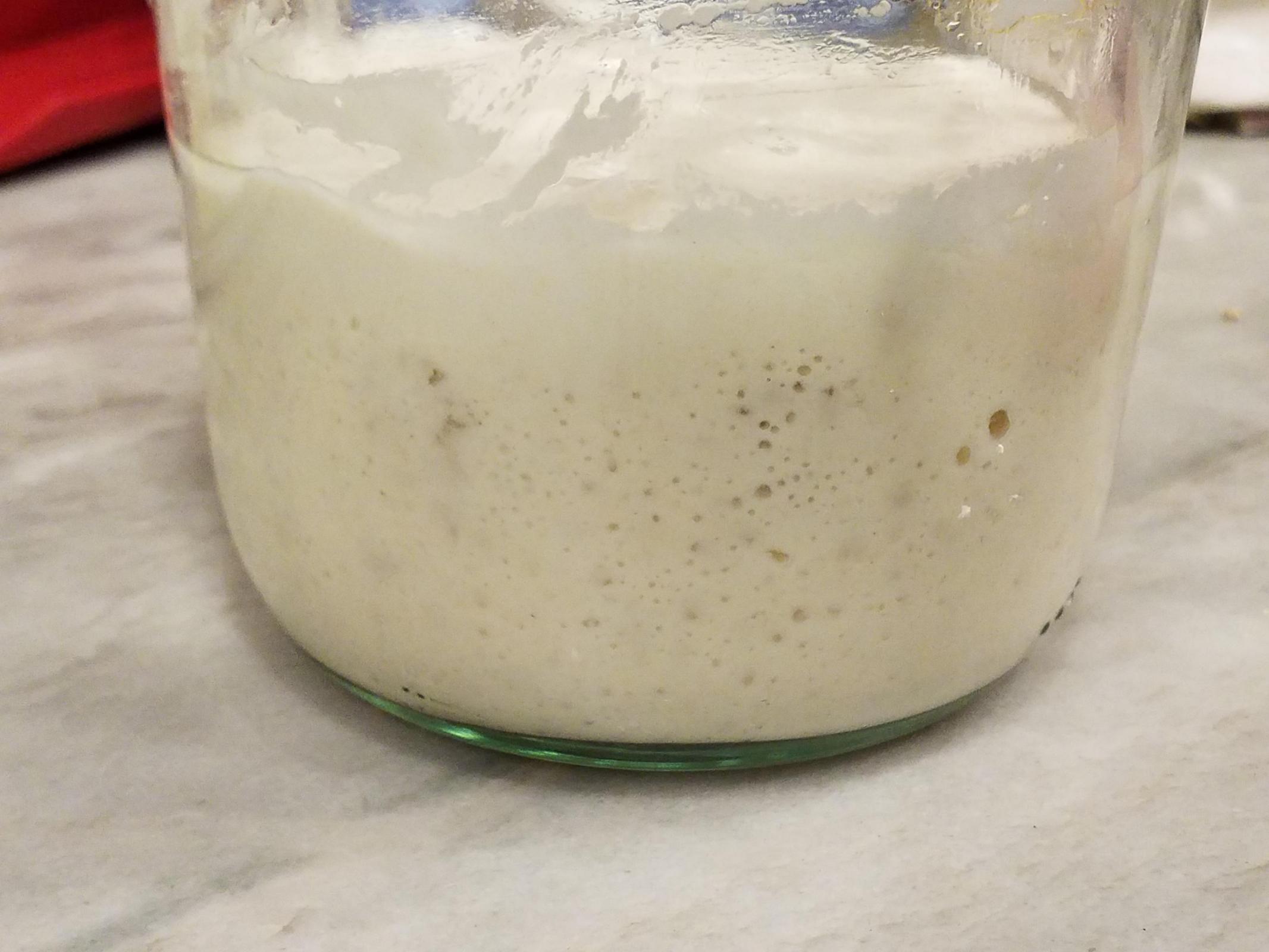 Is that 10 starter : 40 rye : 50 water?  I will reduce the rye starter at the next feed. It gets really thick and gets lots of holes on the sides, but no holes on the top, and not much height.