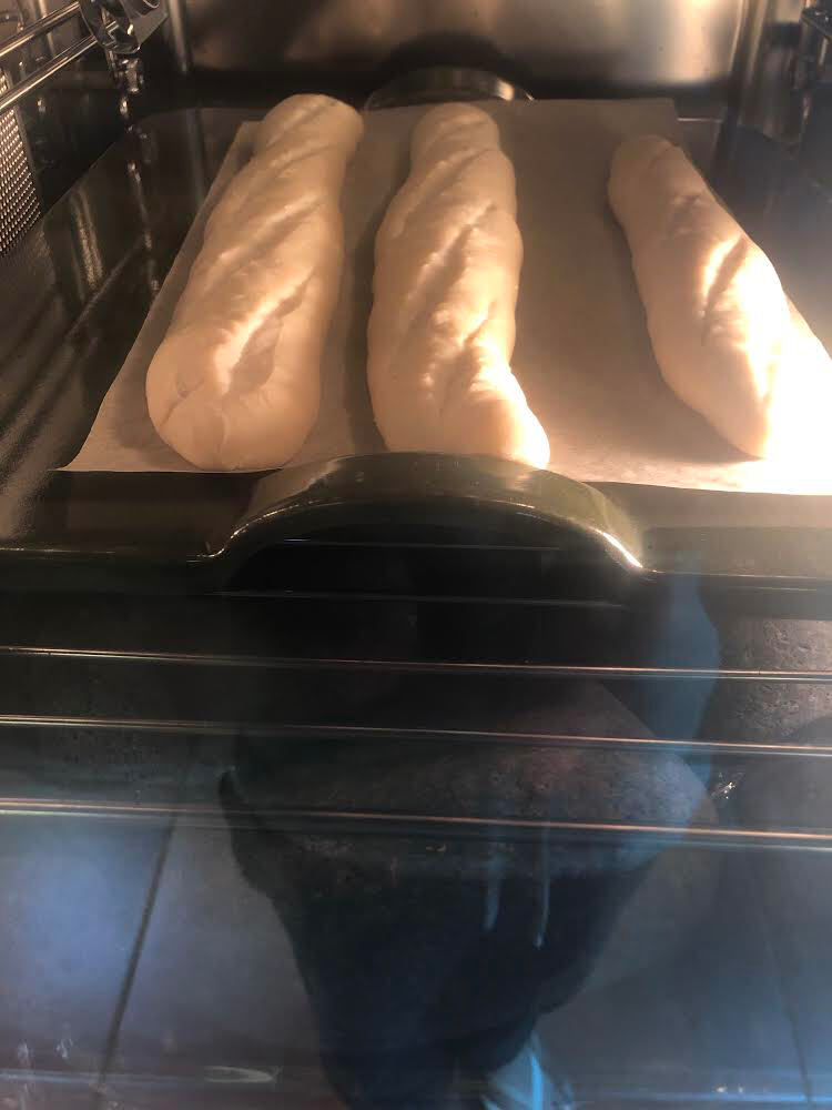 "My baking stone was an Emile Henry enameled baking stone that is quite small - 12in X 10in.” If you are serious about getting into baking anything other than one or two batards or boules, specifically in this case baguettes, long batards, ficelles or demi baguettes you should make the minimal investment in a real baking deck. I went to the local kitchen counter fabricator and purchased a 3/4 inch thick polished granite piece of scrap, cut to the size of my oven rack. $20 USD. If you do so, ensure that you measure slightly less than the full oven cavity size so that there is room for air/steam on all 4 sides of the deck to circulate.Also - know your oven depth before you acquire a baking deck. Over time your muscle memory will have you rolling out dough to just about that same length, give or take an inch, every time. Another point - your doughs are too close together in the oven and they are isolating and insulating each other from the heat. Keep as much space as practicable between the breads.
