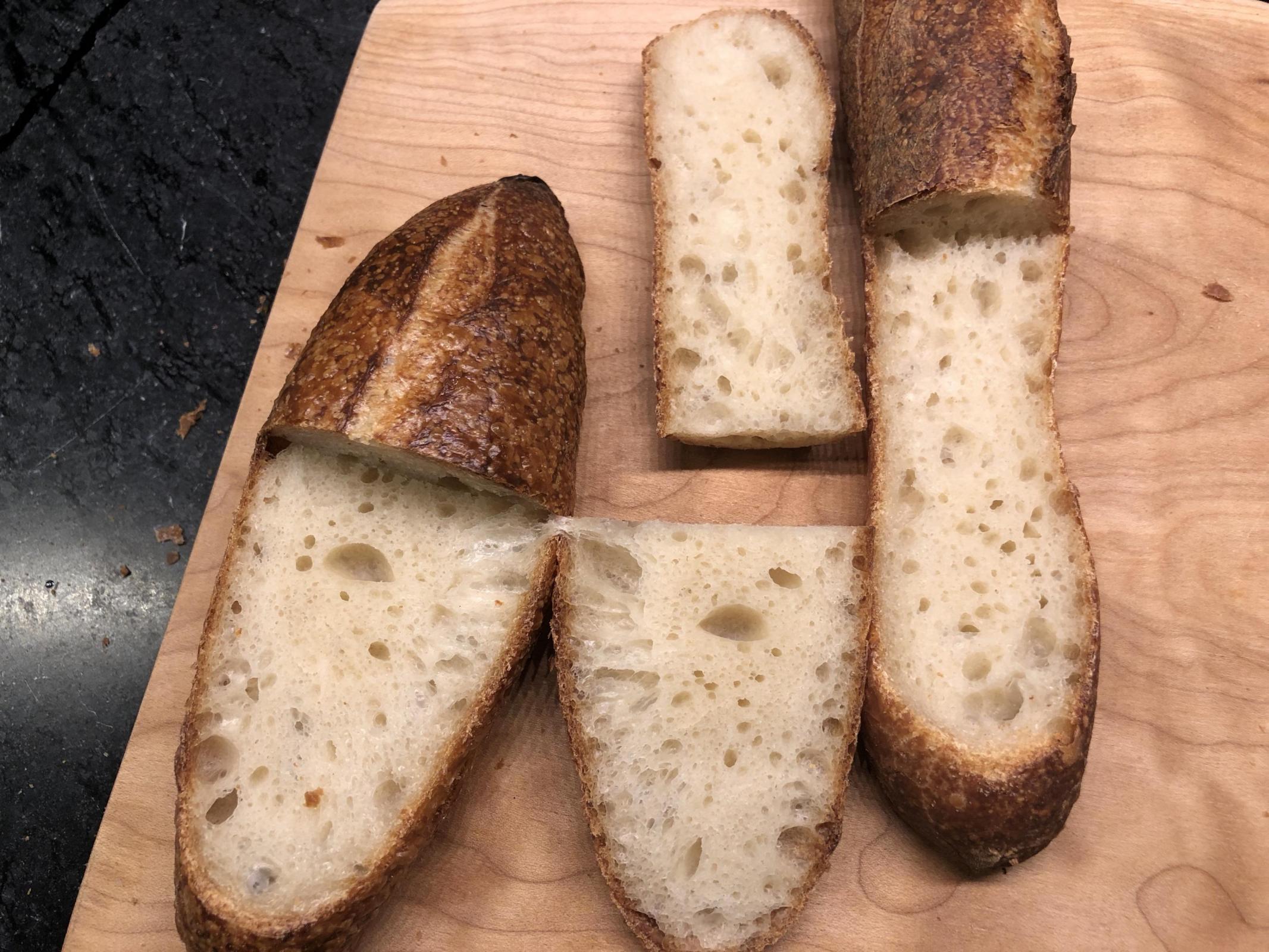 - Overall I needed to bake 3 batches and I feel that the skin got a little dry in the later batch. The second batch had a shiny crust but the third batch and the first batch look dull. Incidentally, the second batch was the one where the glass dish cracked, so maybe the burst of steam helped. I also feel that the underside is not dark enough. The scoring with the lame could be deeper maybe? The bread is not as holey as I would like and the crumb is dense - so maybe I needed to let it rise more or do different proportions or different flour? As I needed 3 batches, maybe I should bake a half batch or pop the dough back in the refrigerator and shape the second half later. Or maybe I should do 2 small baguettes and the rest as a batard or a boule?