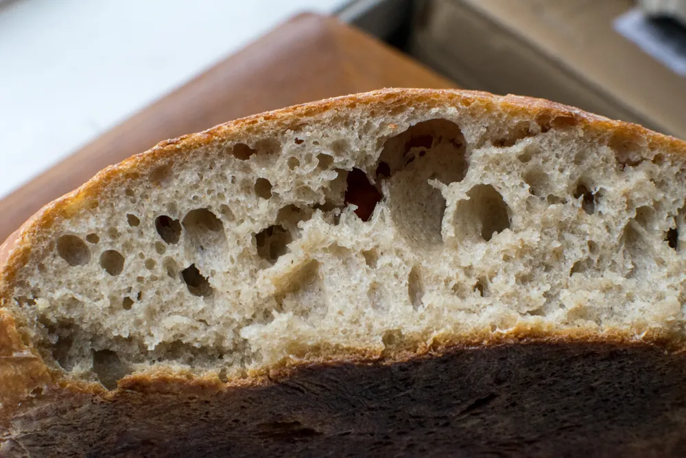 The outside of your bread looks great! The blisters are super nice.