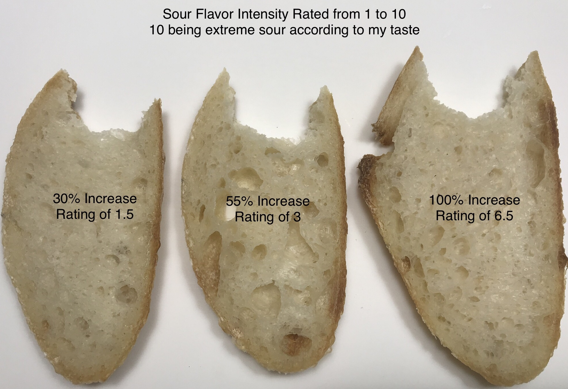Again, I was somewhat surprised that even after a 200% bulk ferment increase, the last loaf came out with a pretty good crumb. I think the biggest factor will be % increase during final ferment, but have not figured out how to calculate that as precisely as the above experiment.