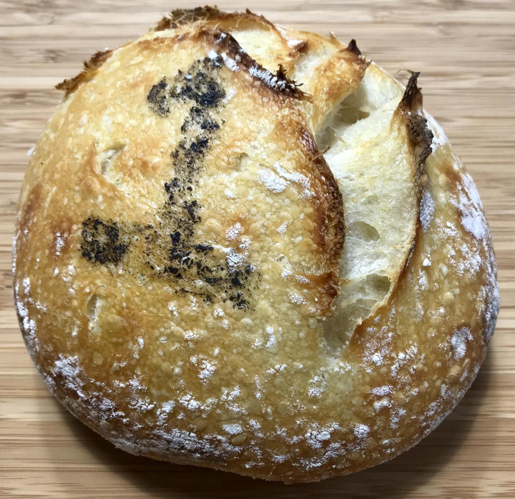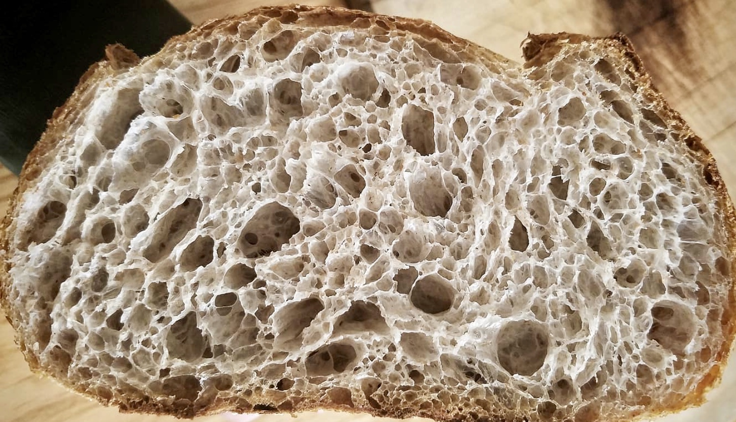 That example (which doesn't appear in any of the pictures in this thread) is only the most extreme case of a very common situation, in which crumb openness is not 100% even. That was my point in suggesting that only the densest portion of the loaf should be judged on openness. A few large bubbles shouldn't count for anything.