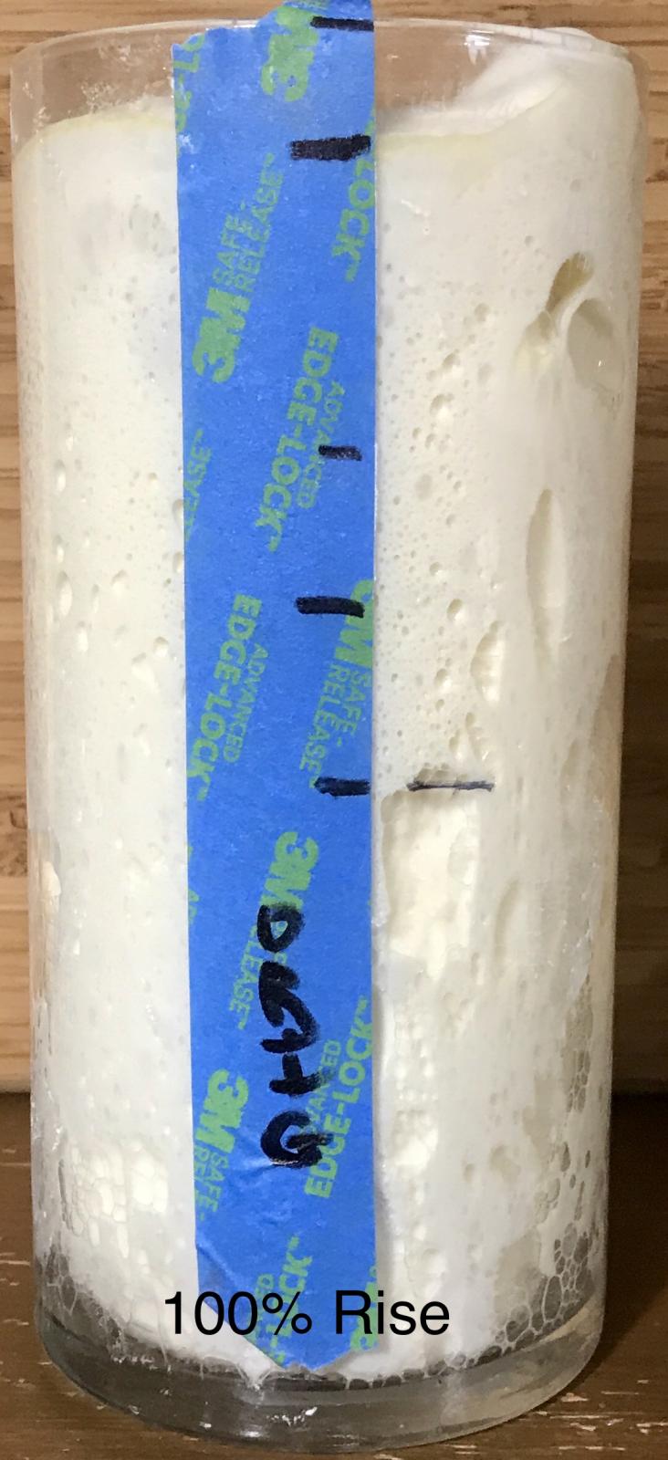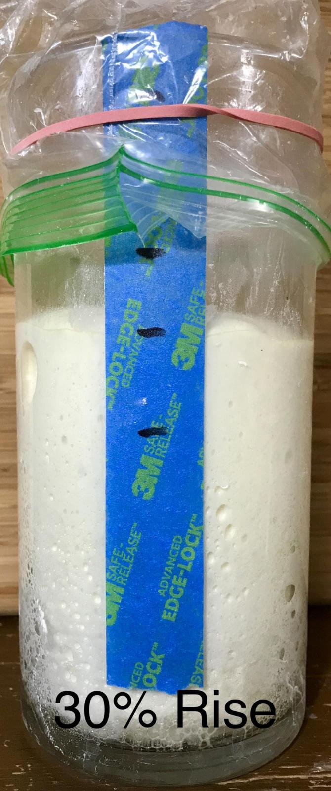 I am working on finding 3 identical clear, straight sided vessels that will contain 500g dough and allow for a minimum of 100% rise. For those interested Here is a Link to a discussion dealing with converting the actual volumn of a dough to grams, or milliliters of water in displacement. Initial testing seems to indicate that the weight of bread dough is very close to it’s weight in water where volumn is concerned. And since 1g weight of water is 1ml of volume, the percentage of rise may be very simple to calculate. I plan to test this theory on larger weight (500g) in order to confirm the concept. If this is correct, and our test doughs are 500g we can mark the percentage of rise on each vessels s follows. A 500g dough with a target rise of 30% would need to rise to a level equal to 650g of water. (500 x 1.30 = 650)