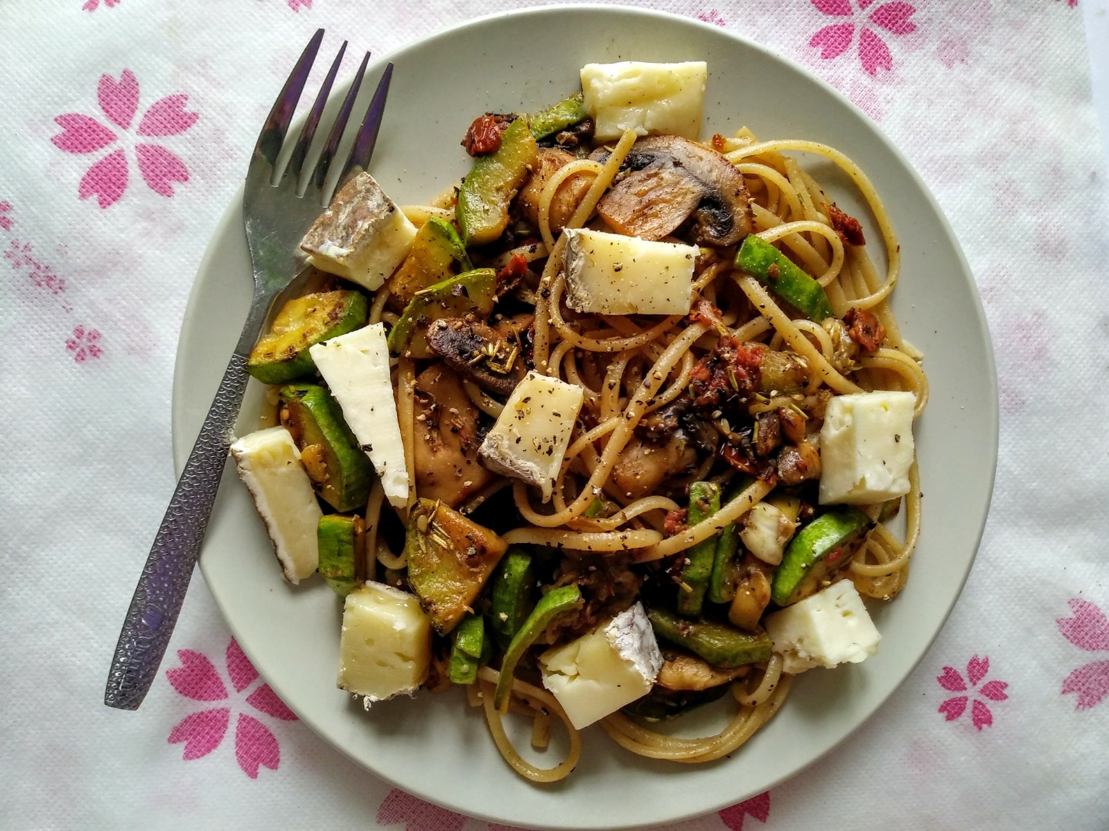 Tangy cheese lightens a pasta dish…? Linguini in sun-dried tomatoes & rosemary zucchini sauce with Tomme de Crayeuse