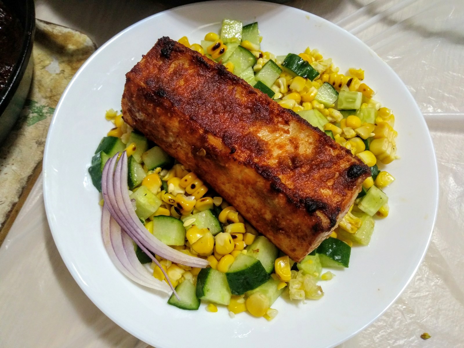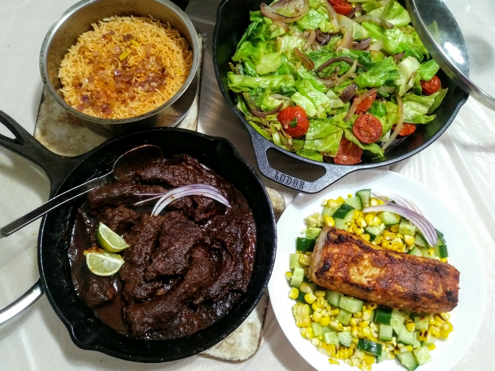 Mexican rice, sautéed cabbages with cherry tomatoes, blackened swordfish, and… What is that burnt mess??