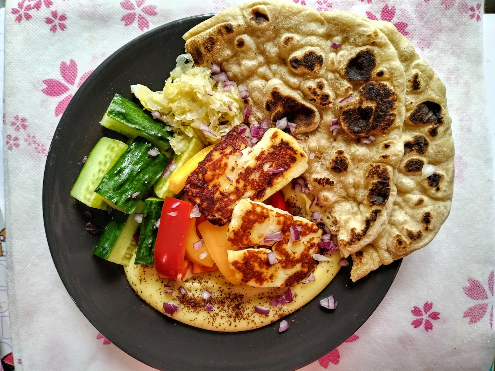 Sumac hummus veggies platter with 50% www SD naan and grilled halloumi