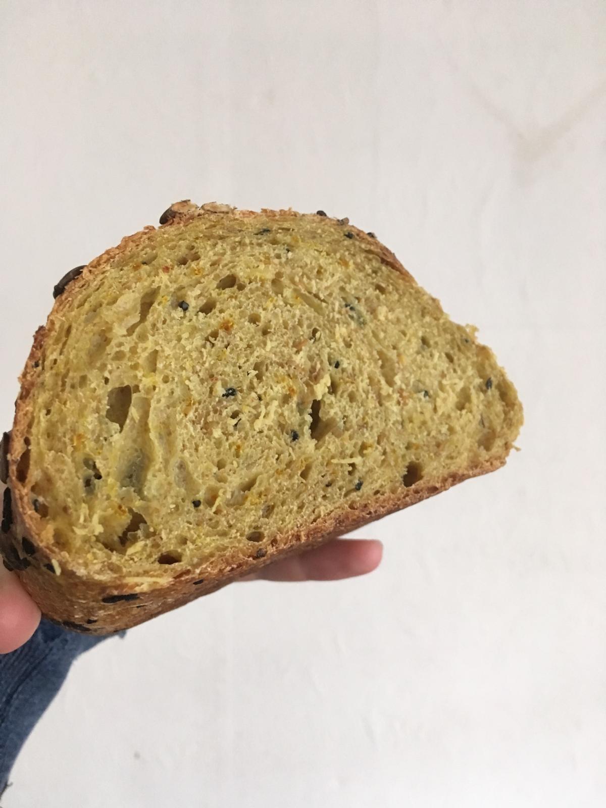 Finding myself with a batch of overcooked brown basmati rice, I decided to try adding some to my dough, along with a grain and seed soaker. And because it seemed a natural thing to do with basmati, I also grated in some fresh turmeric, which gave the dough a lovely color and interesting perfume. I made two loaves, but never got to taste any, since grandson was not only heading off to Brussels to see his girlfriend, but also down to Lyon to see his brother. He was kind enough to send a crumb shot and to describe the crumb as "dense, but voluptuous". So, thanks Ian!