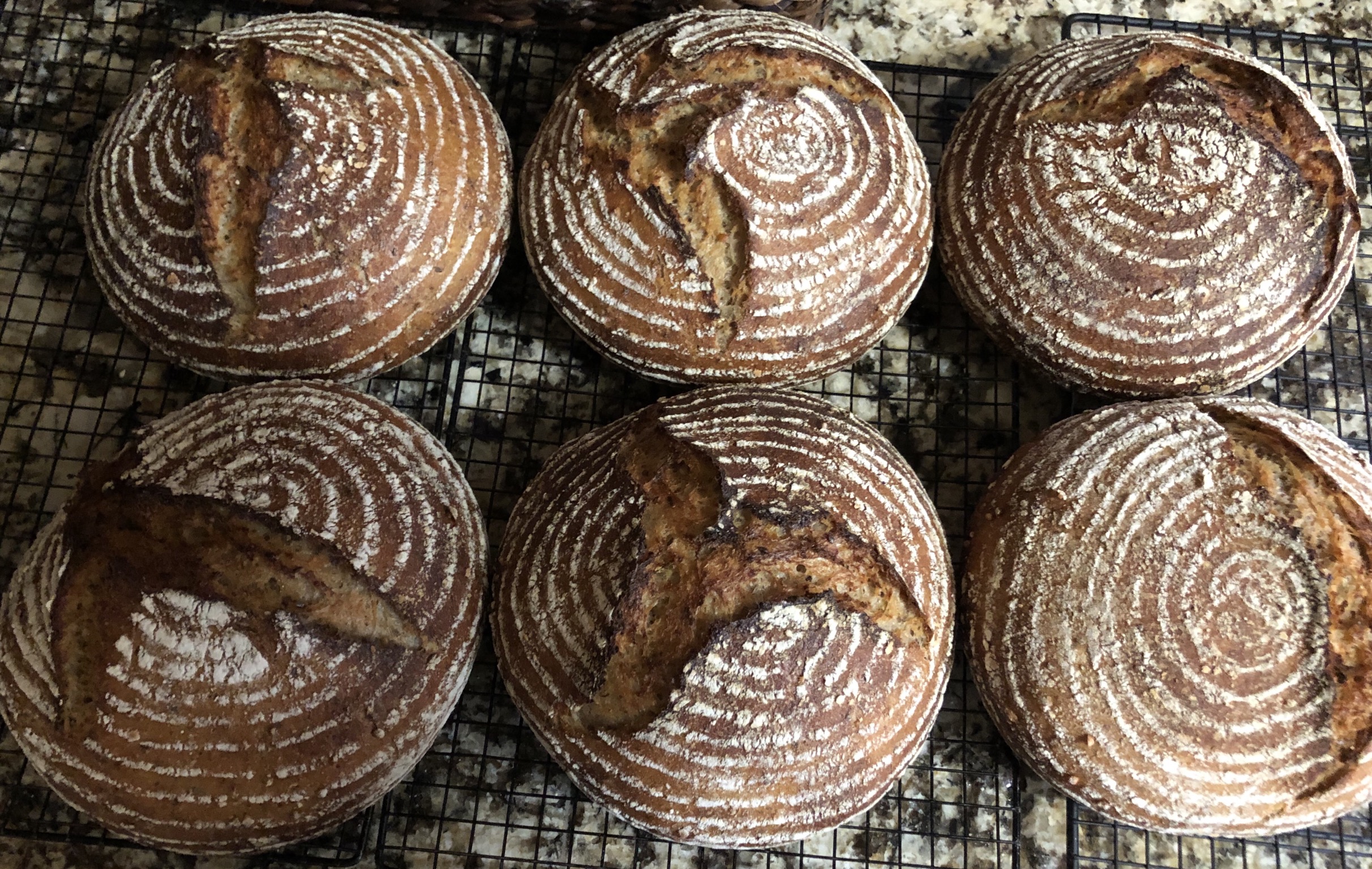 - Sprinkle half rice/half AP flour in the bannetons. Place the dough seam side down in the bannetons. Let rest for a few minutes on the counter and then put to bed in a cold (38F) fridge for 9-10 hours.
