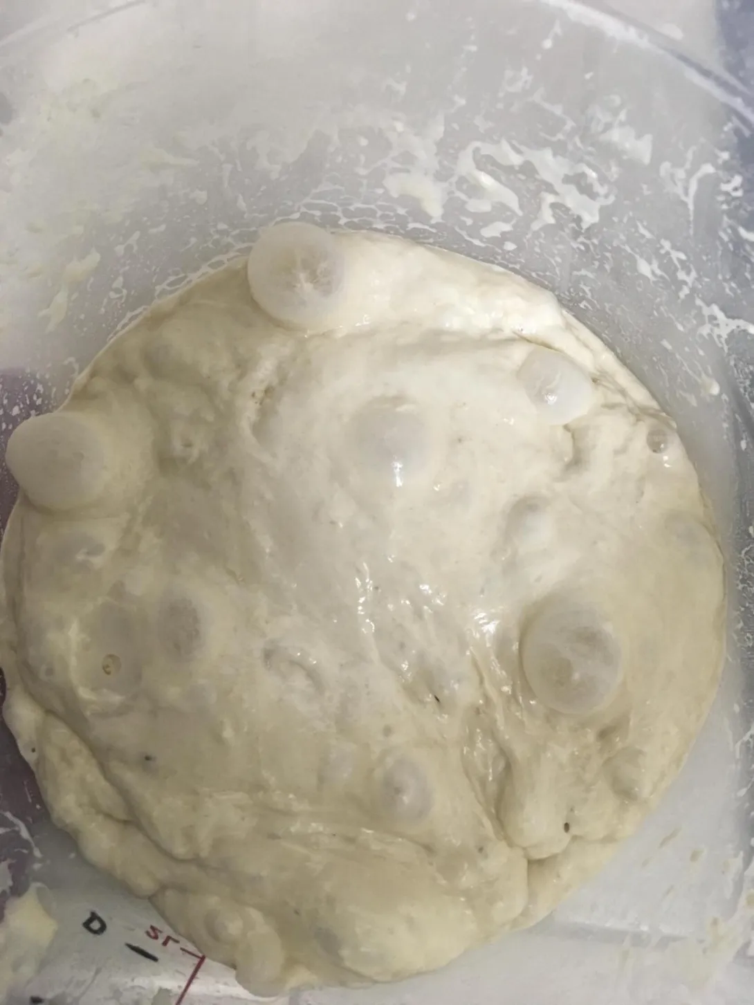 I've never made a loaf this bad.  I like holes but wow.  I’m guessing over although it had just doubled.  Last time it close to tripled and looked more normal than this.  The indent stayed with the finger dent test.