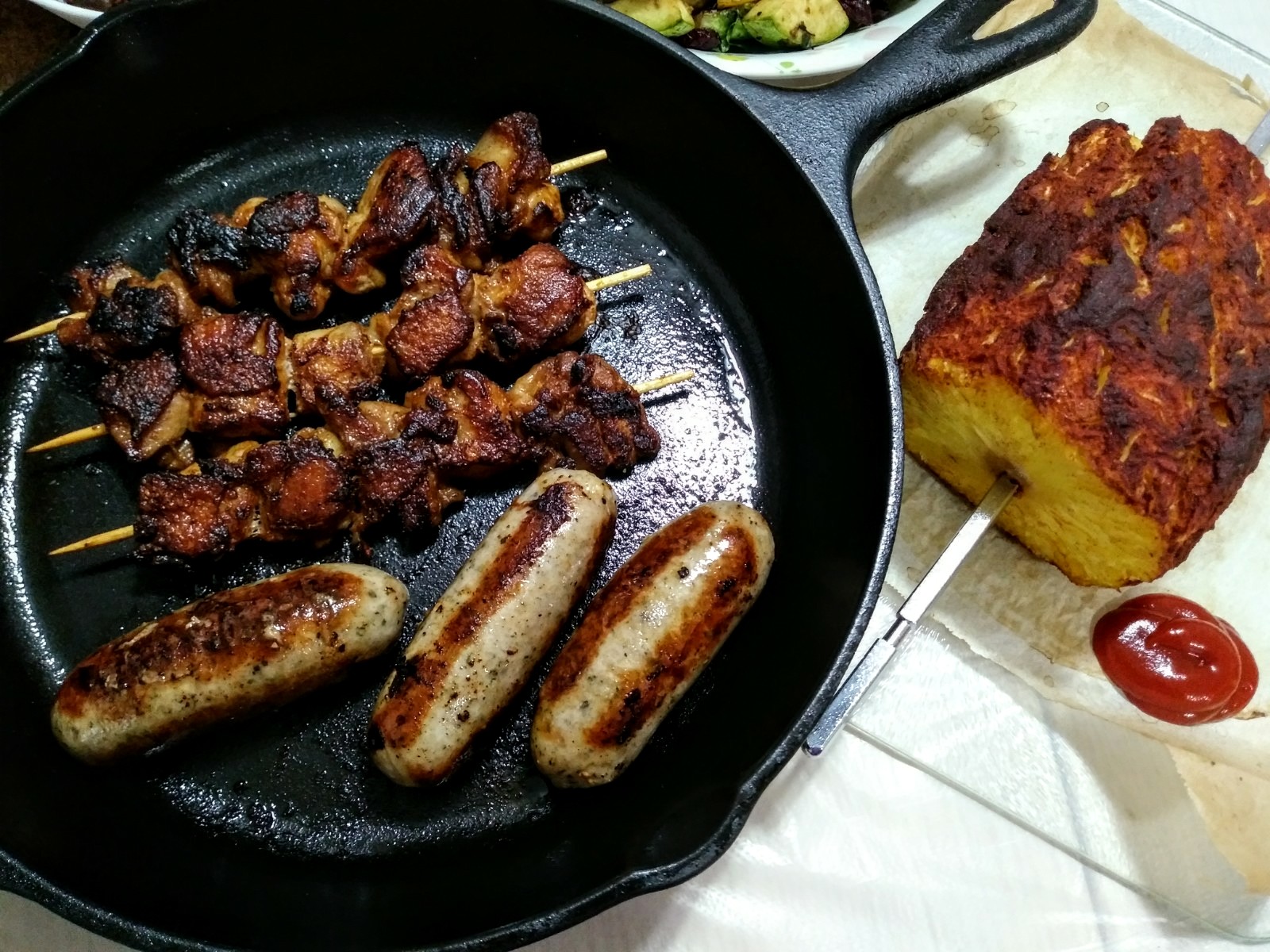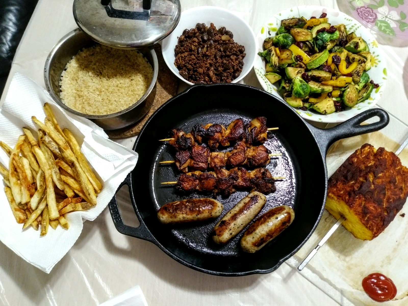 Brazilian-inspired dinner: grilled spicy chicken skewer & pork sausages, cinnamon rotisserie pineapple, chorizo & black beans, brussel sprouts, zucchini & yellow peppers sautéed with dried cranberries, onion seasoned fries and bulgur pilaf