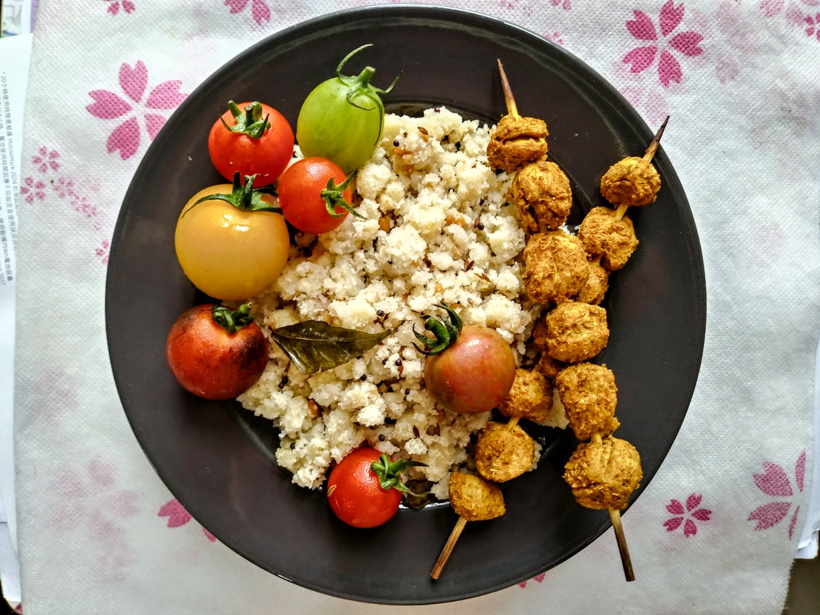 Rava upma with assorted tomatoes and… curried fishballs? Errr… should be soya tikka :)