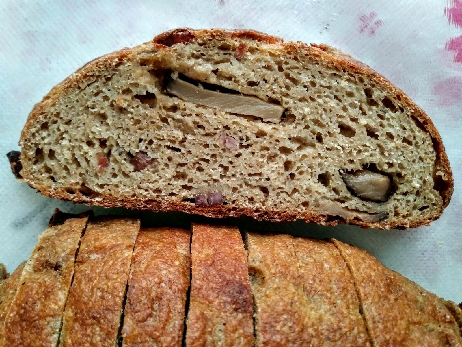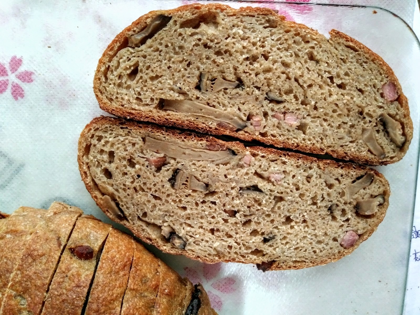 Updated: The bread has a nice springy texture and seems particularly moist thanks to the mushrooms. Surprisingly, the Jinhua ham is pretty subtle while the mushrooms dominate. There is alluring aroma associated with the caramelized onions. For the bread itself, it has little, if any, sour and is mostly sweet from the sprouted grains and spelt.