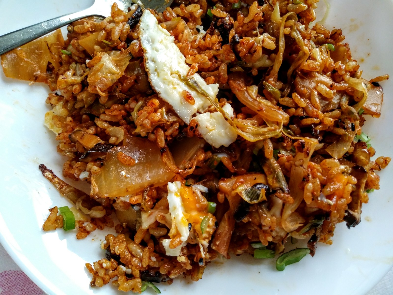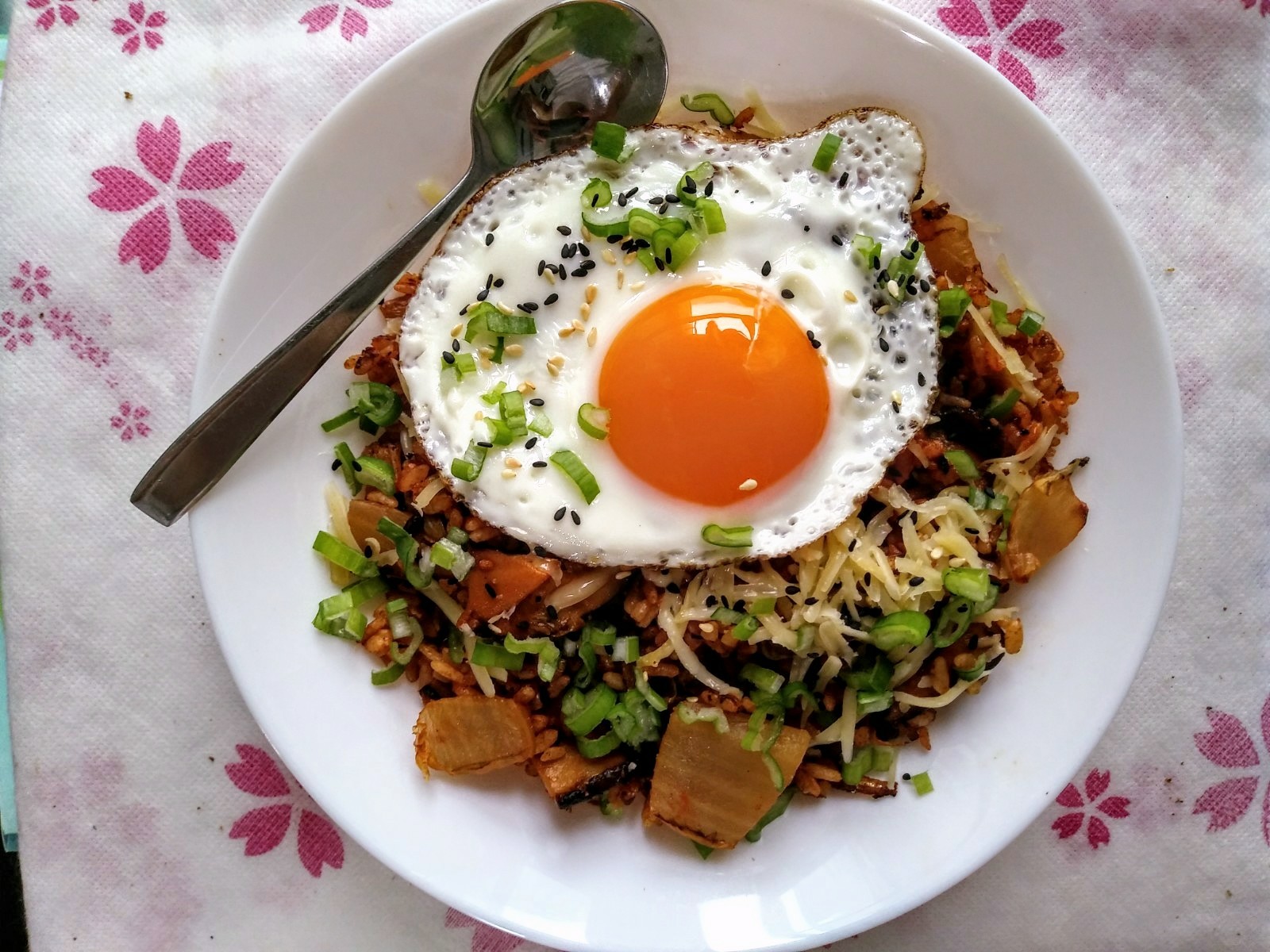 Home-fermented kimchi fried rice with tiny dried fish, Edam cheese and fried egg. This is good. I mean it.