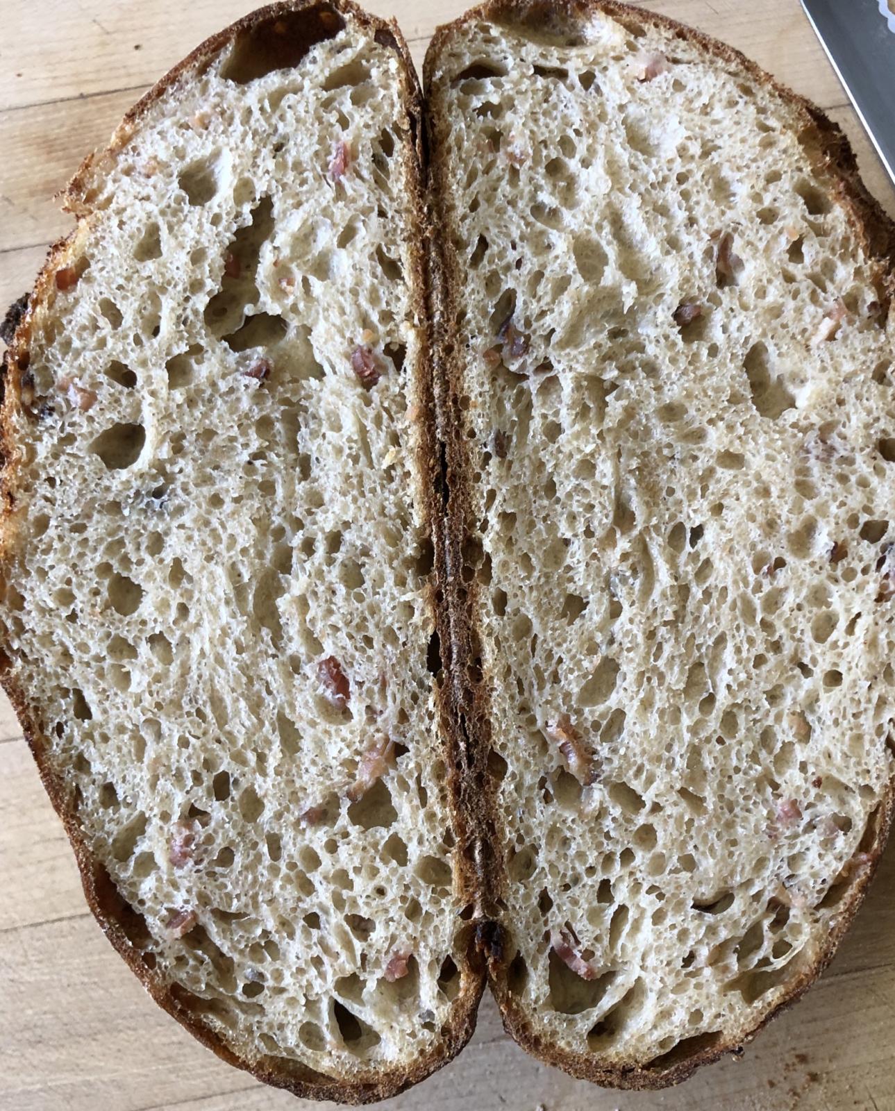 in the same bread! Ian would put some cheese in there and Lucy would put some sun dried tomato in it and call it focaccia but I'm perfectly OK with just bacon and onion. The crumb is just as good as the outside too! Well done - the customers will be asking for way more of this one for sure. I keep meat breads in the fridge and freezer too.... just to be safe if I don't get to eating it very fast. This one wonlt last long with most folks though