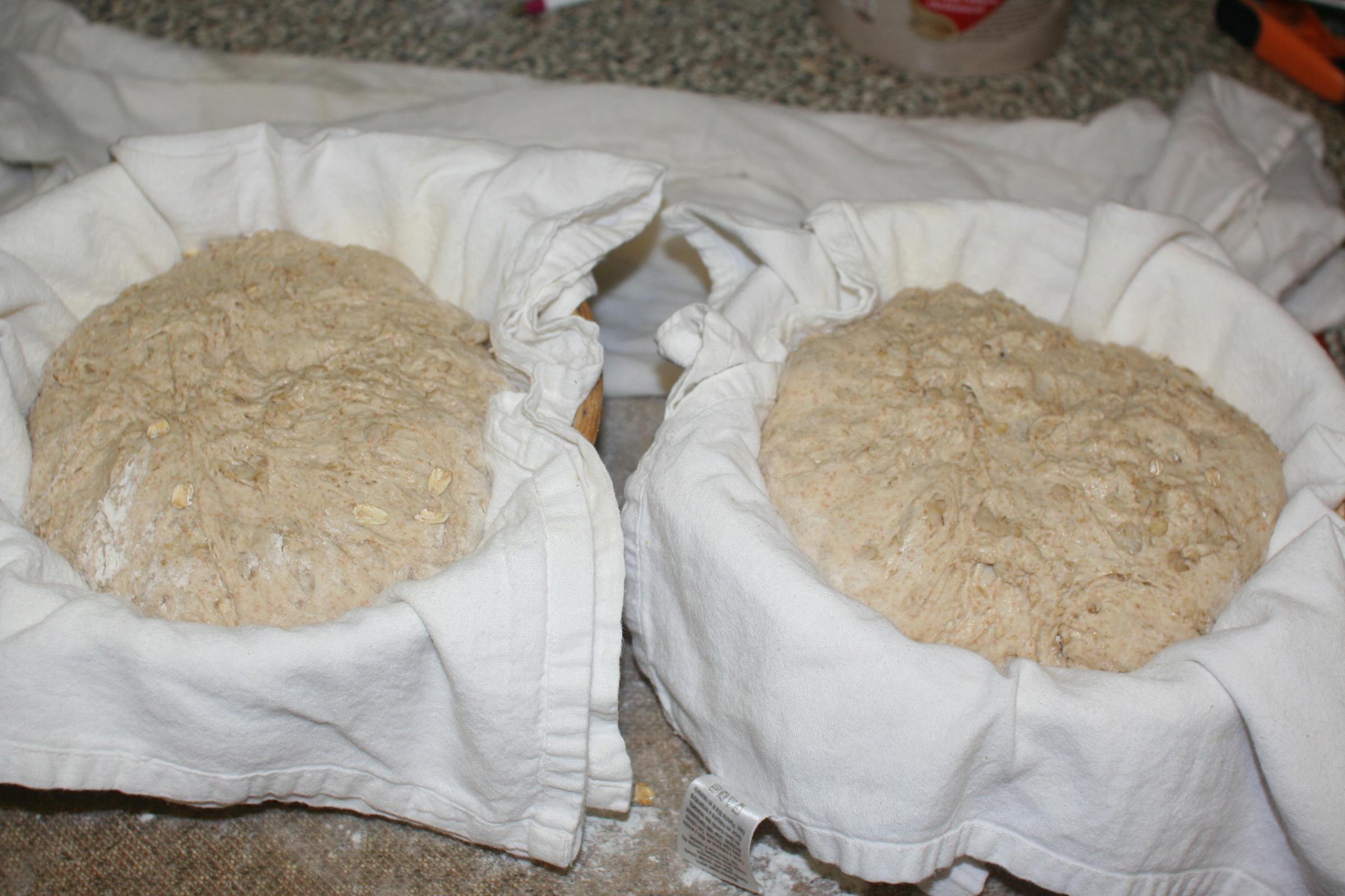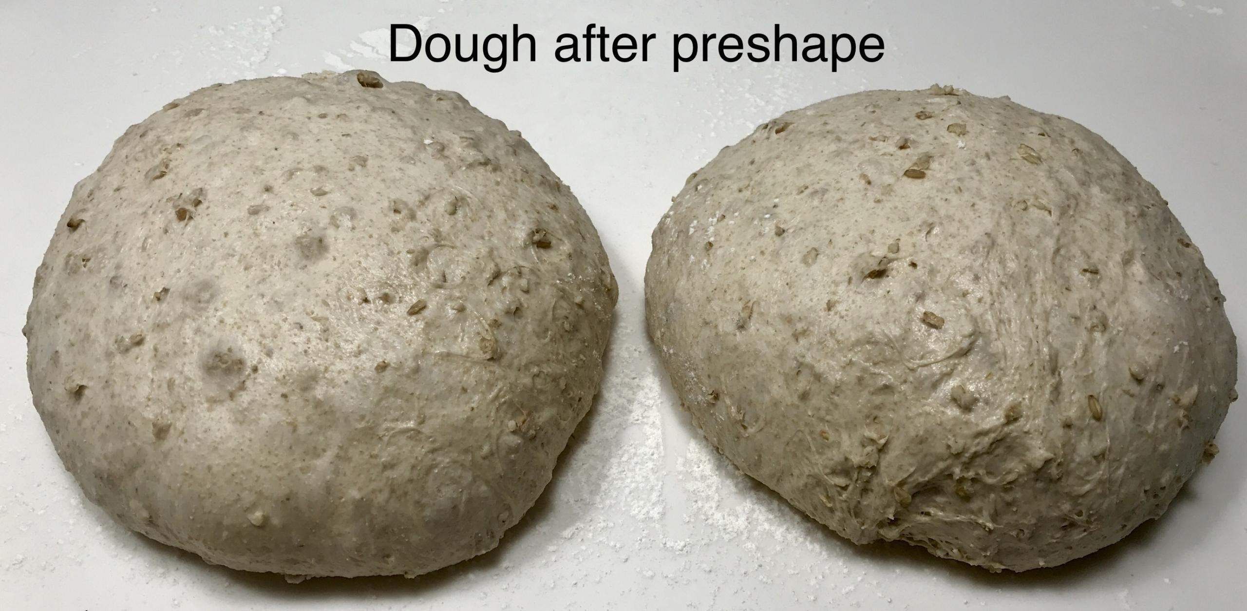 Thank you for compliments. This was a fun bake for me. This is only the second bake with my newly acquired starter. I am so glad I saw the post for this bread. Anyway the process it self was pretty straight forward. However I found the dough to be very wet and sticky. I had a lot of trouble getting nice tight skinned boules. I would blame it on the wrong kind of rolled oats but I found that it was sticky even before the addition of the oats.  The instructions of the Quaker oats had the same ratio of water but the timing was, "done in 5 minutes."   I tried to follow Leos instructions for the Bobs red mill oats, that caused mine to began to burn! I had to really spend some time incorporating the oats, they were far from creamy. To my elation, I seem to have done a standup job!. Dan your pre-shaped boules look totally different than mine did. In fact if you look at Leo's. boules in his proofing baskets they have the same rough top look mine did. Looking and your well structured shinny balls I would think you used a lot less water. The taste was very nice, I found the crumb to be extremely tender. What I learned. Cooking on my pizza steel with a porcelain Dutch oven overturned on the bread will require a lower oven temperature next time. As far as the oats go I want to try using either the Bobs that Leo used or uncooked steal cut oats, with same rolled outs for topping. My pre-shaped balls. Granted my skill level is not exceptional, but I have worked with some wet doughs and this one rates near the wettest!.