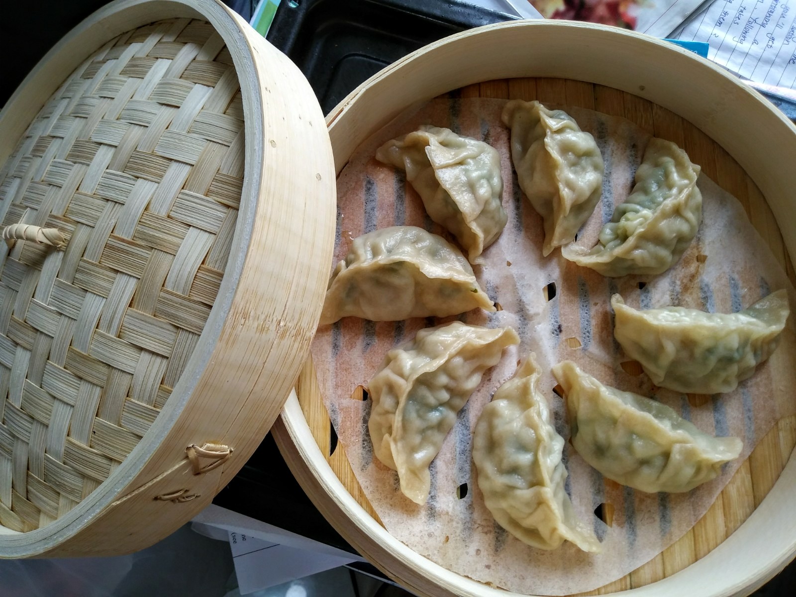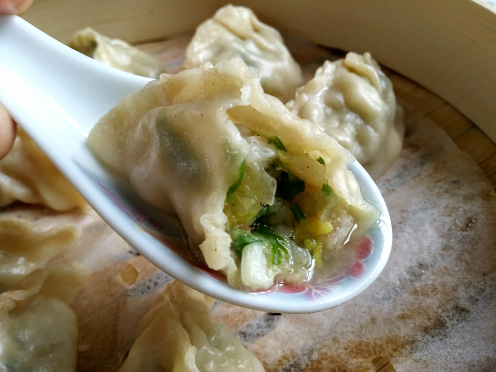 Steamed shrimp, Napa cabbage and cilantro dumplings with extra chewy wrappers (25% Indian atta)