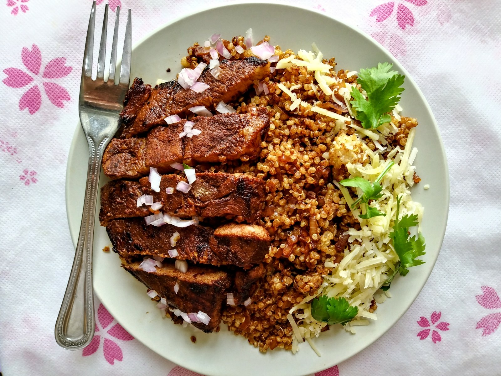 Pan-grilled pork collar chop with cheesy caramelized onion quinoa, in ancho & guajillo peppers sauce. Flavor explosion!