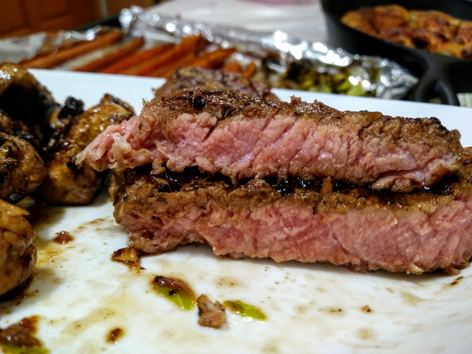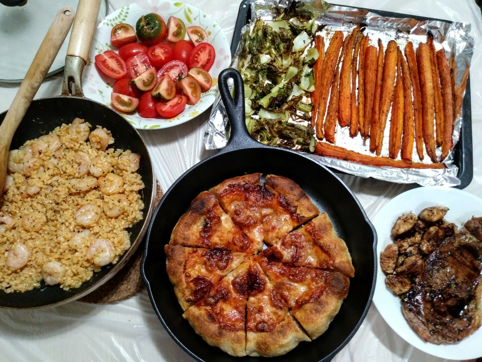 Pepperoni mozzarella SD pizza, tomato shrimp risotto, ghee roasted carrots & mustard oil roasted cauliflower leaves (hands down my two favorites dishes), mixed heirloom tomatoes, and pan-grilled rib-eye steak in a garlicky thyme pan sauce