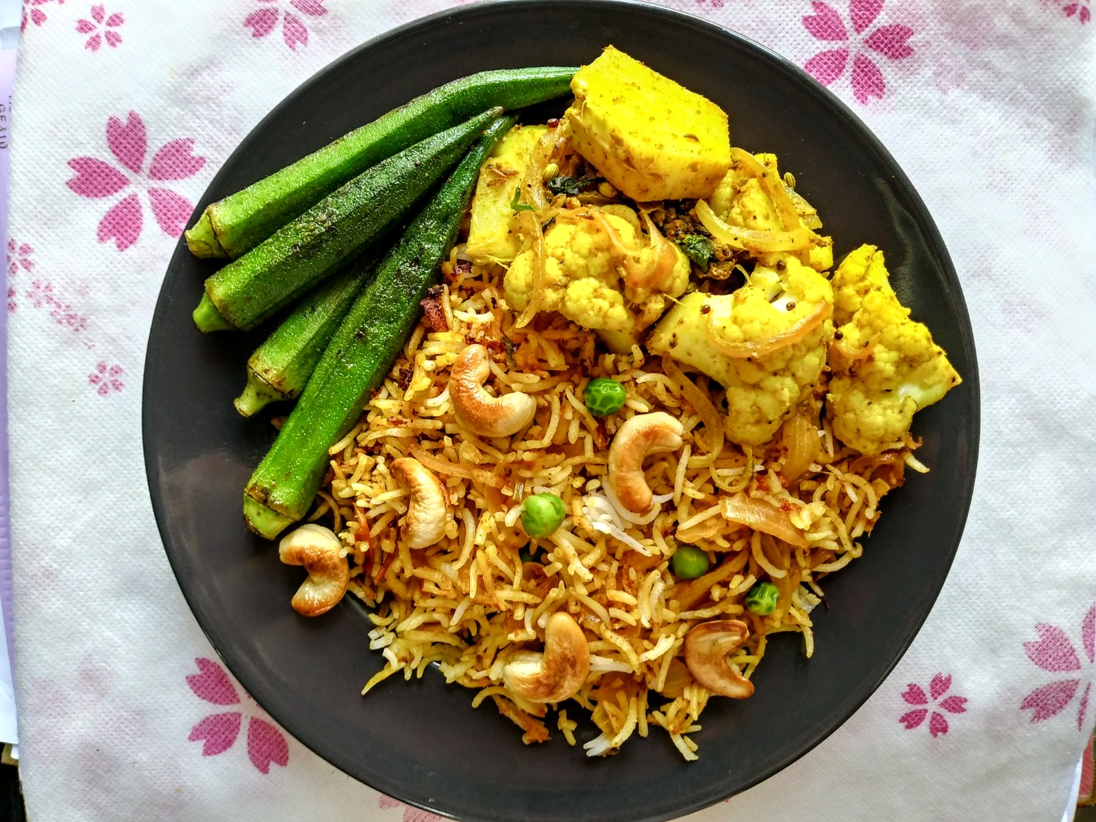Cashew pea biryani, bharwa bhindi (spices stuffed okra), tandoori gobi (grilled cauliflower marinated in a spicy yogurt sauce). Another dish that doesn’t skimp on flavor!