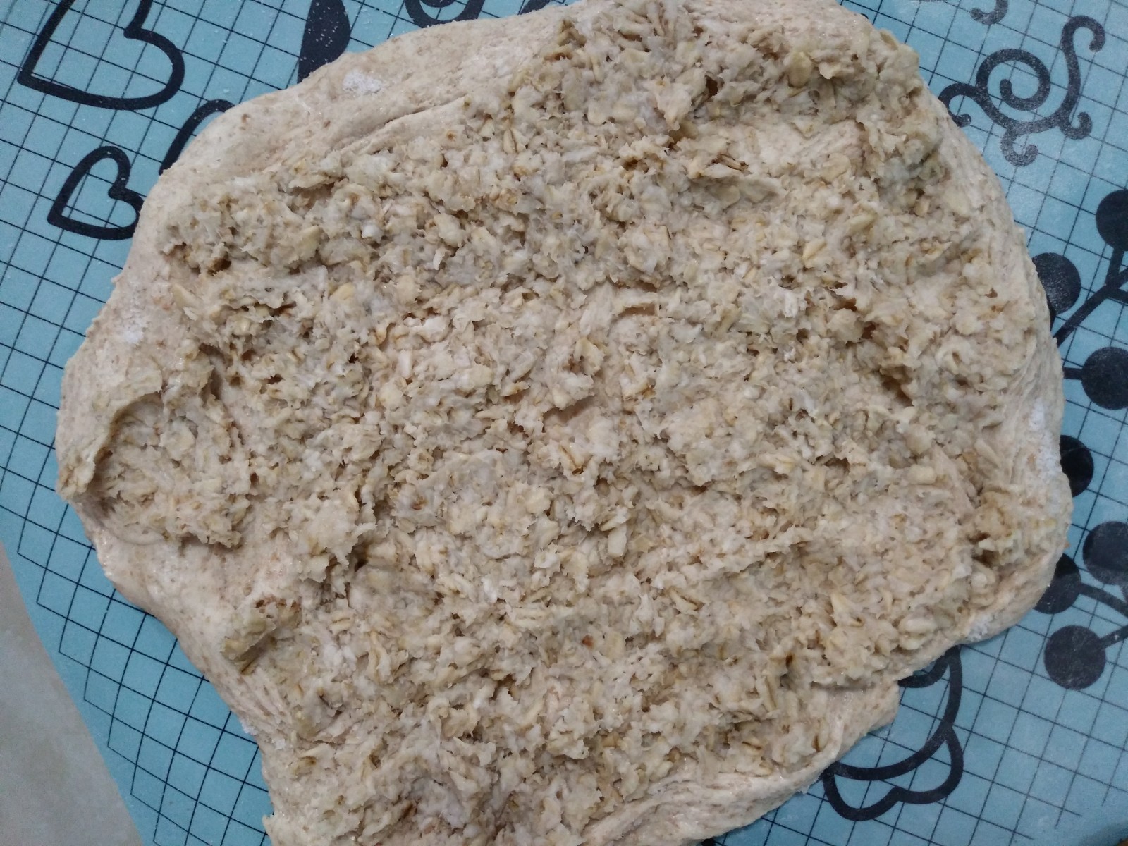 The dough was a bit sticky but quite stiff, probably because I lowered the hydration and used extra thick rolled oats. It was way less extensible than my usual 30% whole grain dough so I reduced the set of folds constructed.