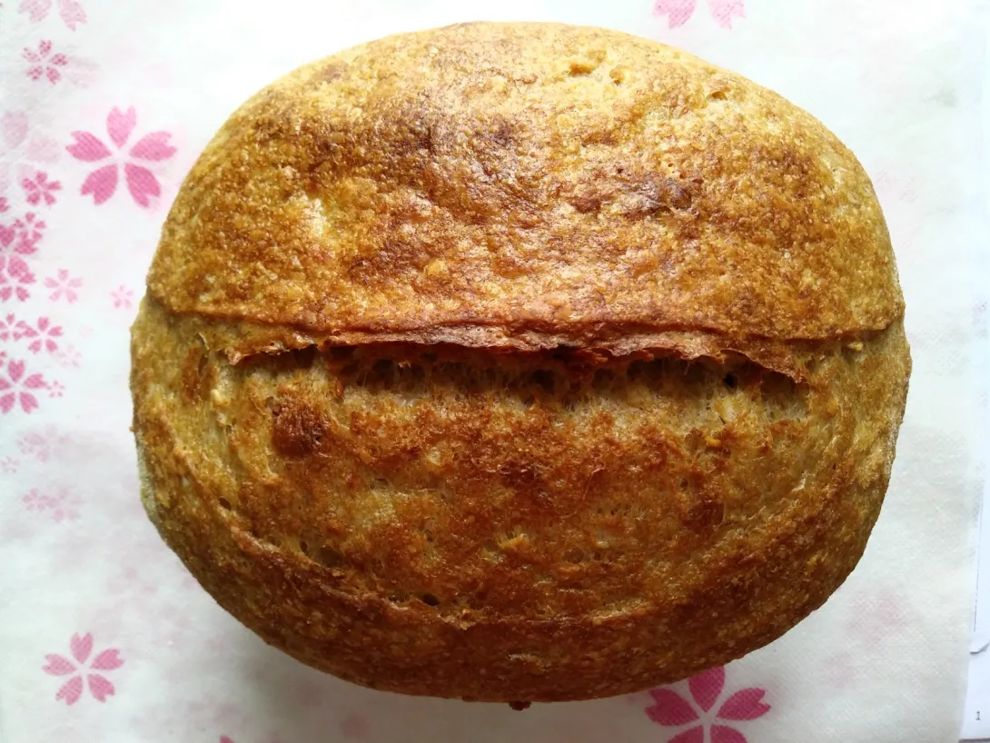 The oven was preheated at 250°C/482°F. I scored and spritzed the dough, and baked it directly from the fridge at 250°C/482°F with steam for 20 minutes then without steam for 20 minutes more until the internal temperature reached 203°F. It was cooled for 1 hour before slicing.