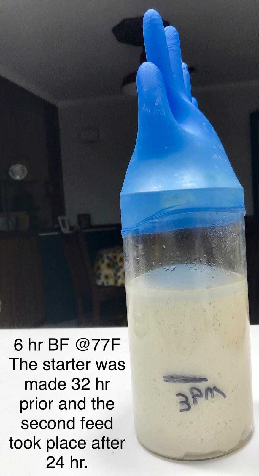 The starter is moving so fast I thought why not try a bake. So, after the initial feed, then the second feed (24 hr later), and finally 6 hr into the second feed, the dough was mixed. It was 30 hours since the starter was initially started. It was maintained @ 77F. The dough was mixed at 70% hydration, rested 30 min and then 150 slap and folds, then rested 30 more min. The first 150 slap and folds looked promising. I have never felt a dough that was so silky and smooth. BUT when I went to continue the second set of slap & folds things turned very bad. The dough looked like soft serve ice cream and was sticky beyond description. The gluten development was obvious, but the dough was not manageable. So, I had to call upon the knight, Sir Lancelot. Added some KA Sir Lancelot high protein flour in order to save the dough. Added quite a bit and the dough got better, but not good. Below is an image of the risen dough (77F) after a 6 hr BF. Something is going on with this 30 hr starter. Oh! I attribute the sloppy dough to the pineapple liquid. That stuff is powerful. I marinated 2 steaks in the pineapple juice overnight. The meat turned to mush, literally! It fell apart when handled. IF I try that again they will marinate no longer than 2 hr.