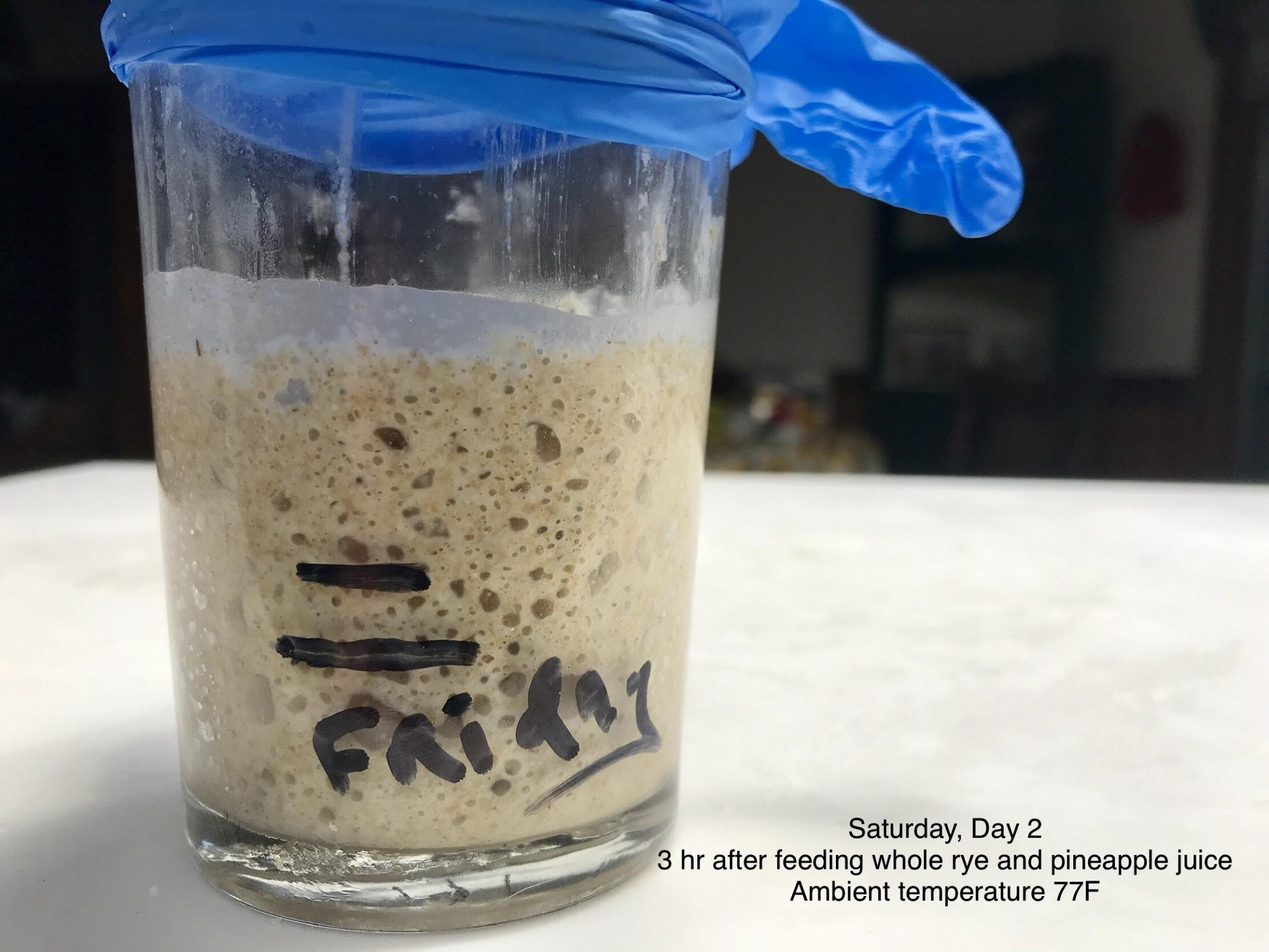 The starter uses home milled organic rye and fresh squeezed pineapple juice. The image above shows tremendous growth 3 hours past the second (24hr) feed. I have never experienced the foul smelling bad bacteria (Leuconostoc species) phase that I read about. And I am fairly sure this is not the case with this starter. It seems fine.