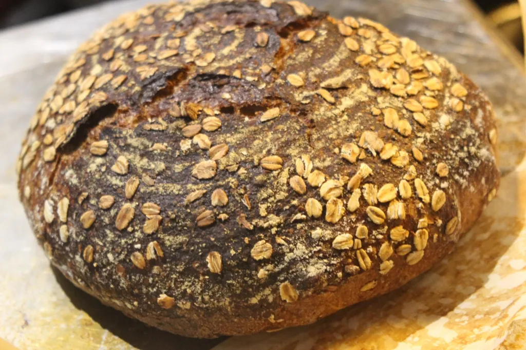 Last time, the dry oatmeal made the dough easier to handle. This time, the oats released moisture and made the dough harder to handle. For moister oatmeal, such as was used in this loaf, decreasing the hydration slightly might be prudent.
