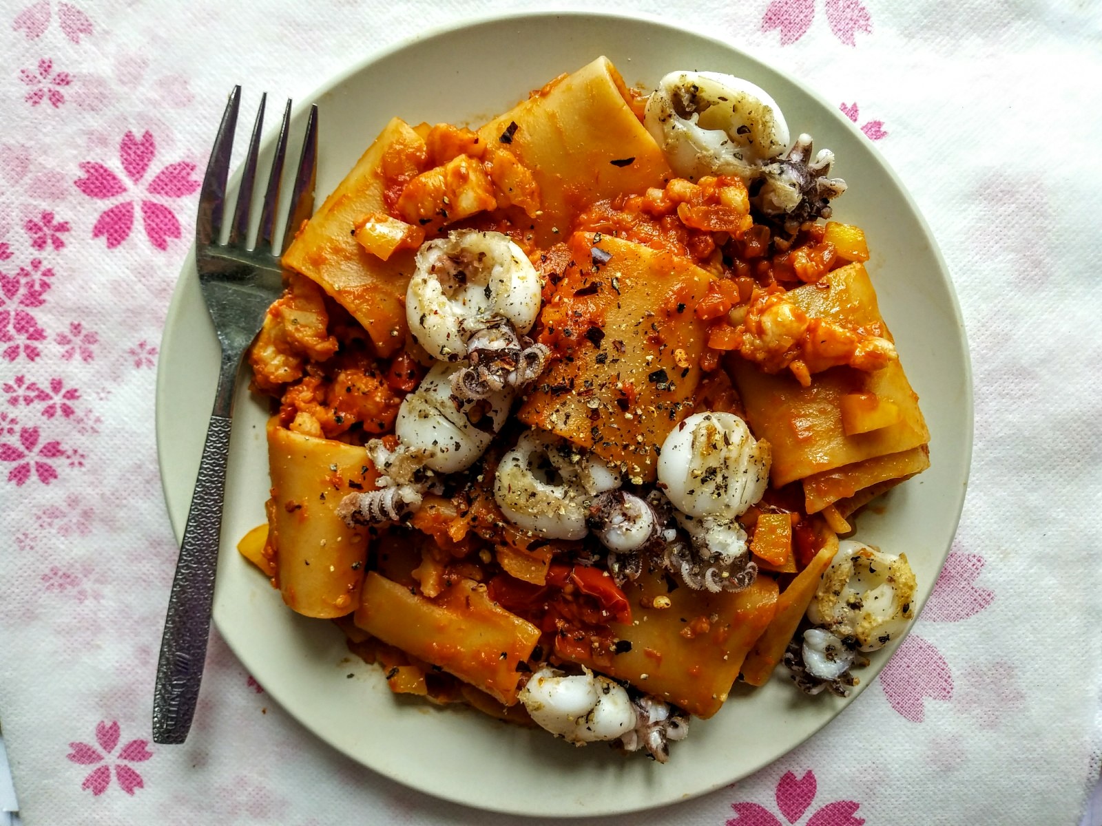 Calamarata al Ragu di Pesce with pan-grilled baby cuttlefish. Feels so sophisticated!
