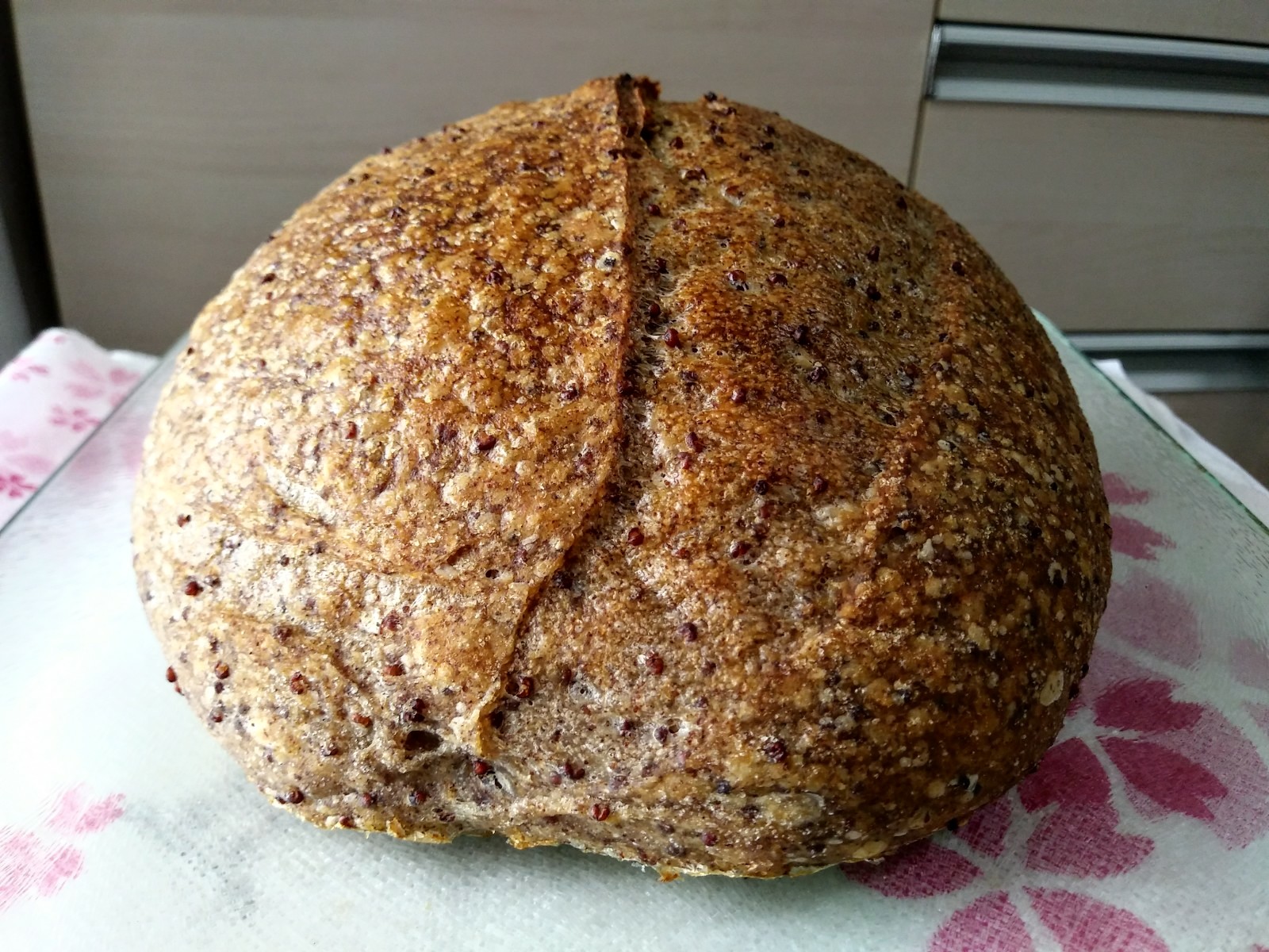 Unsurprisingly, the dough over-proofed during the retard. I had really under-estimated how much the microbial population can grow in an extra hour. Guess the doubling rate is pretty high at 28°C… The purpose of using a mature leaven was achieved though: the bread is distinctively sour. That’s not say it’s lacking in sweetness, quite the opposite in fact, thanks to the malty sprouted grains and fruity Red Fife wheat.
