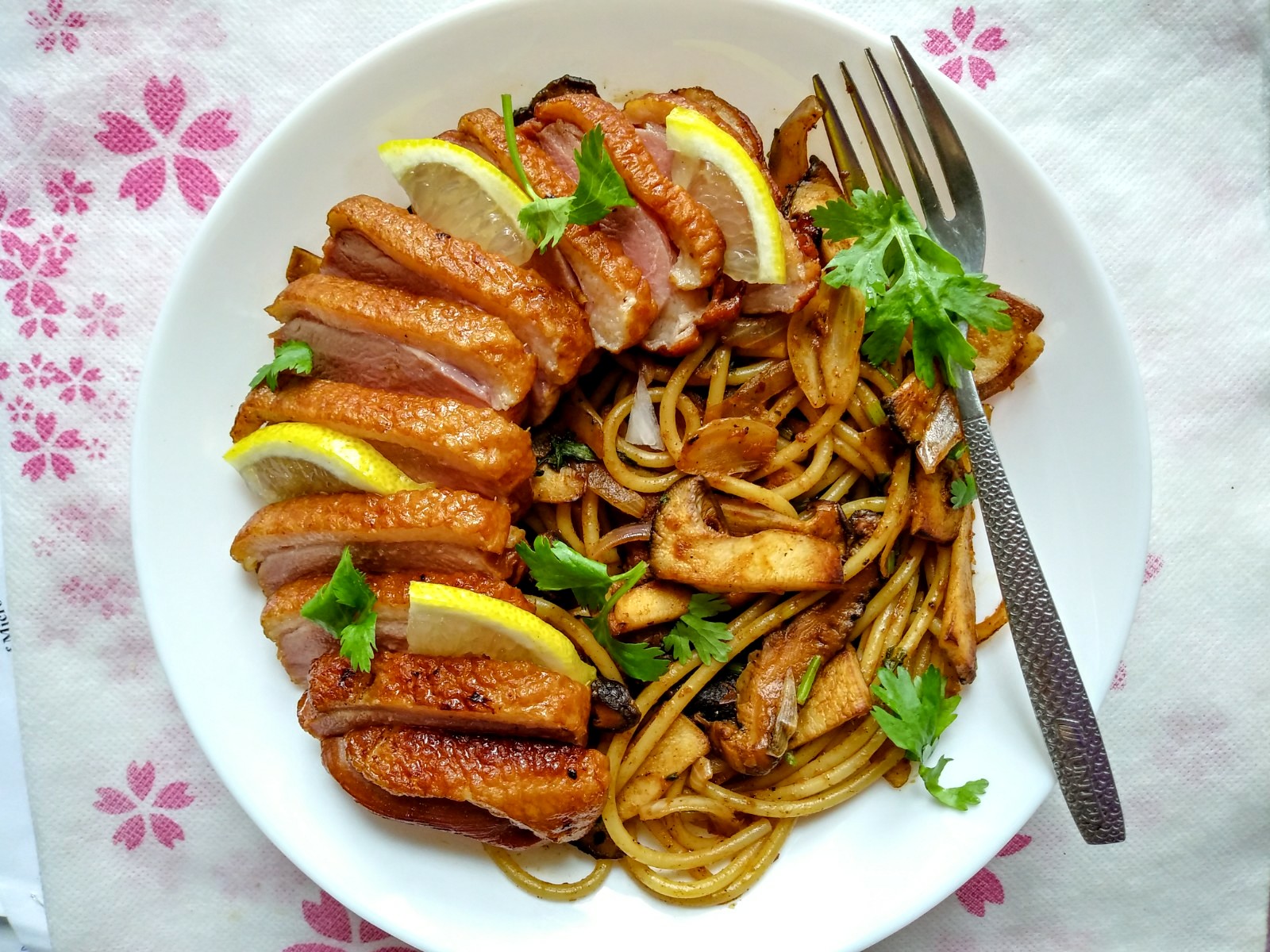Spaghetti in paprika lemon sauce with mushrooms and smoked duck breast