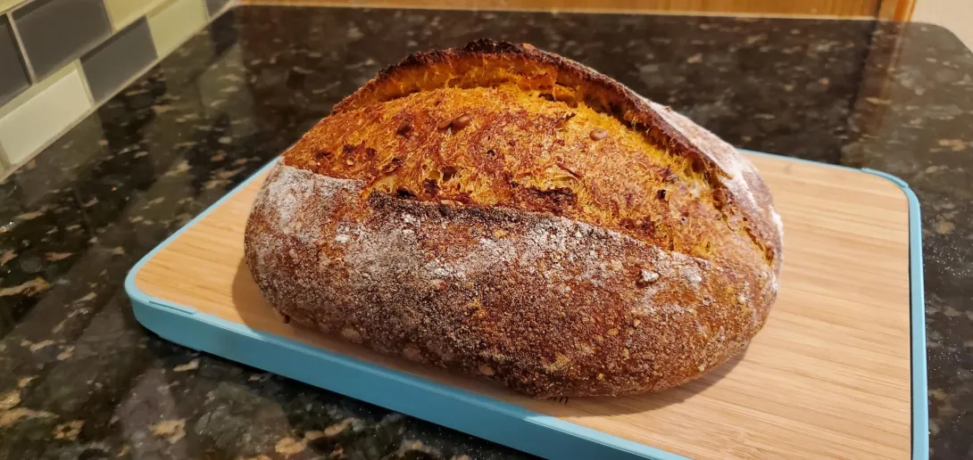 Loaf with carrot, polenta, einkorn, sunflower seeds,crushed coriander seeds.