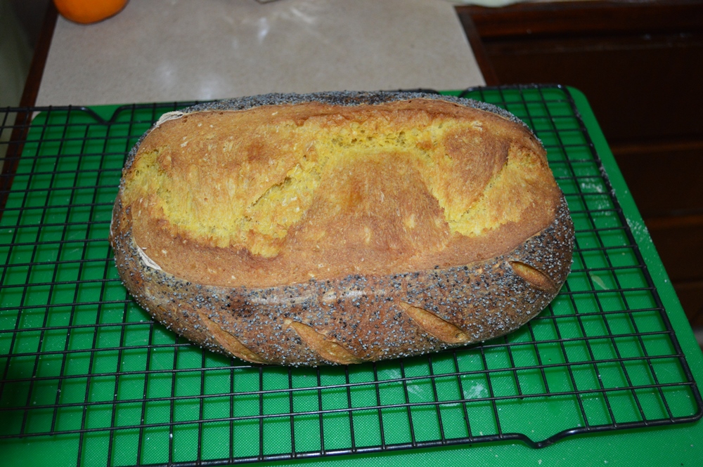 The dough was given a half hour reprieve and rested before a bit more bench action and a nice smooth elastic dough was achieved this was then placed in a bowl to Bulk ferment for several hours. once my wife and the other 2 grand daughters arrived after their visit to the local park that has a flying fox i was relieved of my minding duties and took my dough with me home. I determined that the dough was ready so knocked it back and handed it up to expel the gas and bring it back to a compact shape. it was then covered and given a 30 minute rest. The dough was then shaped and placed in a lined Banneton proofing basket it was placed into a plastic bag and put into the fridge as i was unsure how long the final proof would take and i was due to take my grand nephew for a driving lesson, so the retarding would suit me best. The lesson went well and he will be booking his test very soon. I taught his dad my Nephew to drive many years back. Upon return the dough had still risen i the fridge but it hadn't overproofed so half an hour on the bench whilst the oven heated was Goldie Locks porridge (just right) i was going to bake directly on the pizza stone and utilise a tray with a folded terry towel and boiling water to produce a good steamy environment for the first 10 minutes of the bake when the rapid expansion takes place. The dough piece was rolled from the banneton onto the hot stone, it was brushed with a boiled cornflour wash and sprinkled with poppy seed and given a deep lengthwise slash and some supplementary cuts along the sides the dough was then placed into the oven with the already steaming tray/towel doing its job, for the initial 10 minutes the oven is cranked up full as the steam effect does have a dampening effect on the heat. After 10 minutes and the loaf has finished its spring the door is opened and the tray removed the temperature lowered to 210 and the bake continues. when the towel is hung up in the laundry you can see the amount of steam still coming from it. A further 20 - 25 minutes and the loaf is done pulled from the oven and onto a rack to cool ,be photographed and once quite cool cut open and tasted . So there we have it a Sweet Potato loaf using compressed yeast with a dusting of Turmeric.