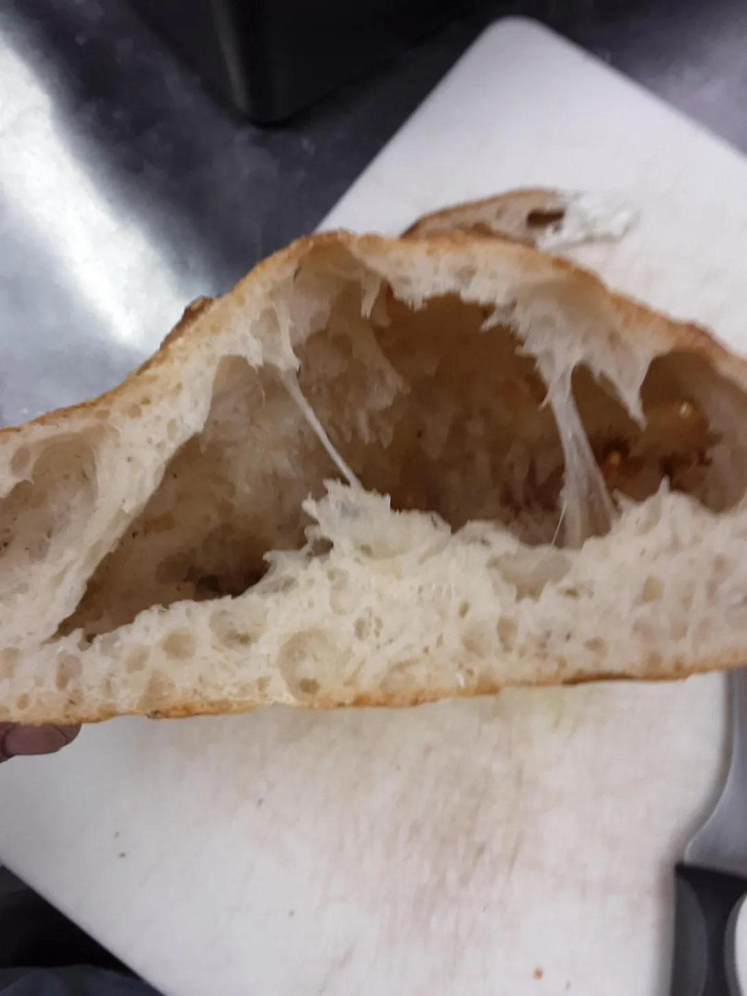 I need some help regarding a problem I have every so often. The focaccia separates at the top crust. I mix, autolyse for 30 minutes, stretch and fold 3 times with 30 minutes rest in between, ferment overnight under refrigeration, either put into a sheet pan or divide like pizza dough. Ferment again overnight. Allow it to rest at room temp for a few hours. Press down and dimple surface, spray with water and drizzle with oil. Bake.