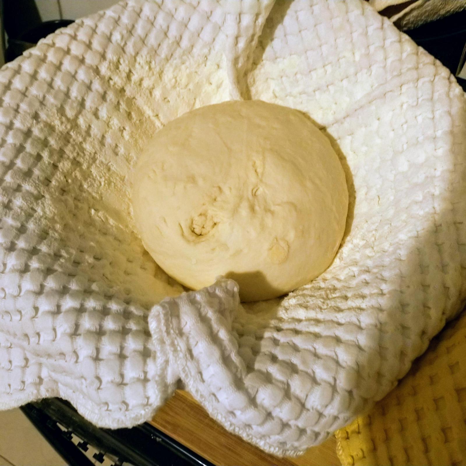 When I shaped it, I placed it on a lightly dusted table, smooth side down, smooshed it a little bit with my finger like you'd do with a pizza, then folded the edges over each other until I got a nice ball, flipped it, rolled it a couple of times and placed it into a bowl with a kitchen towel in it (my proofing baskets are on their way from China)