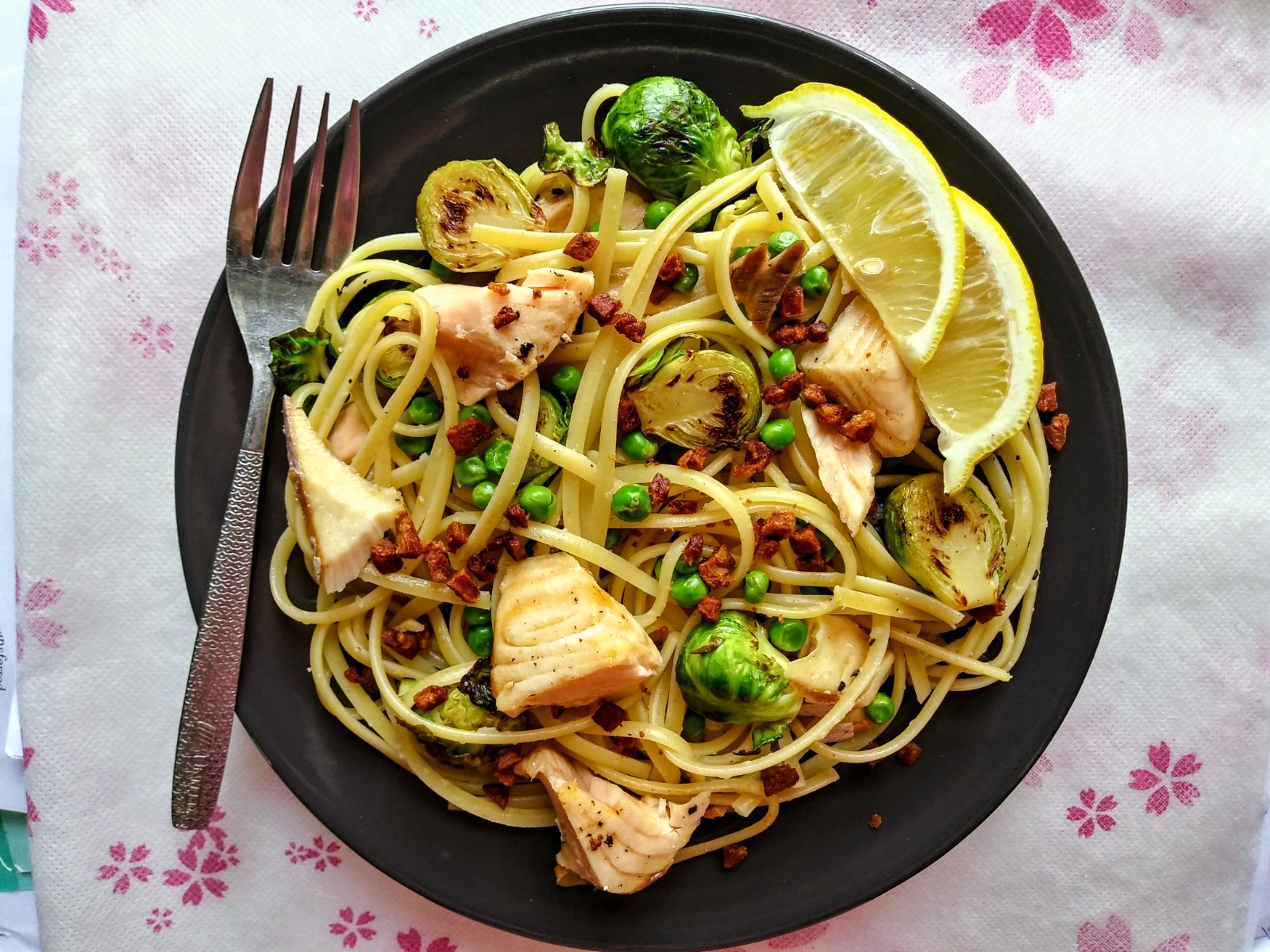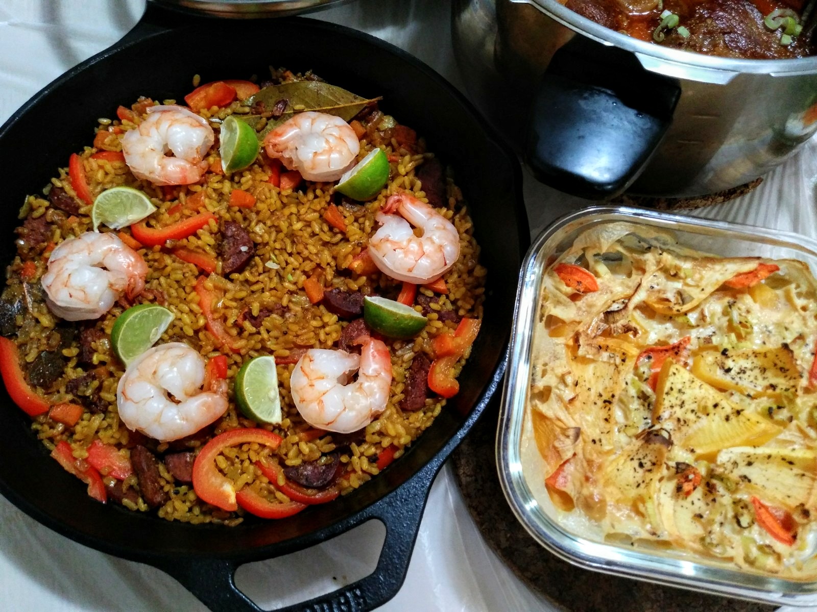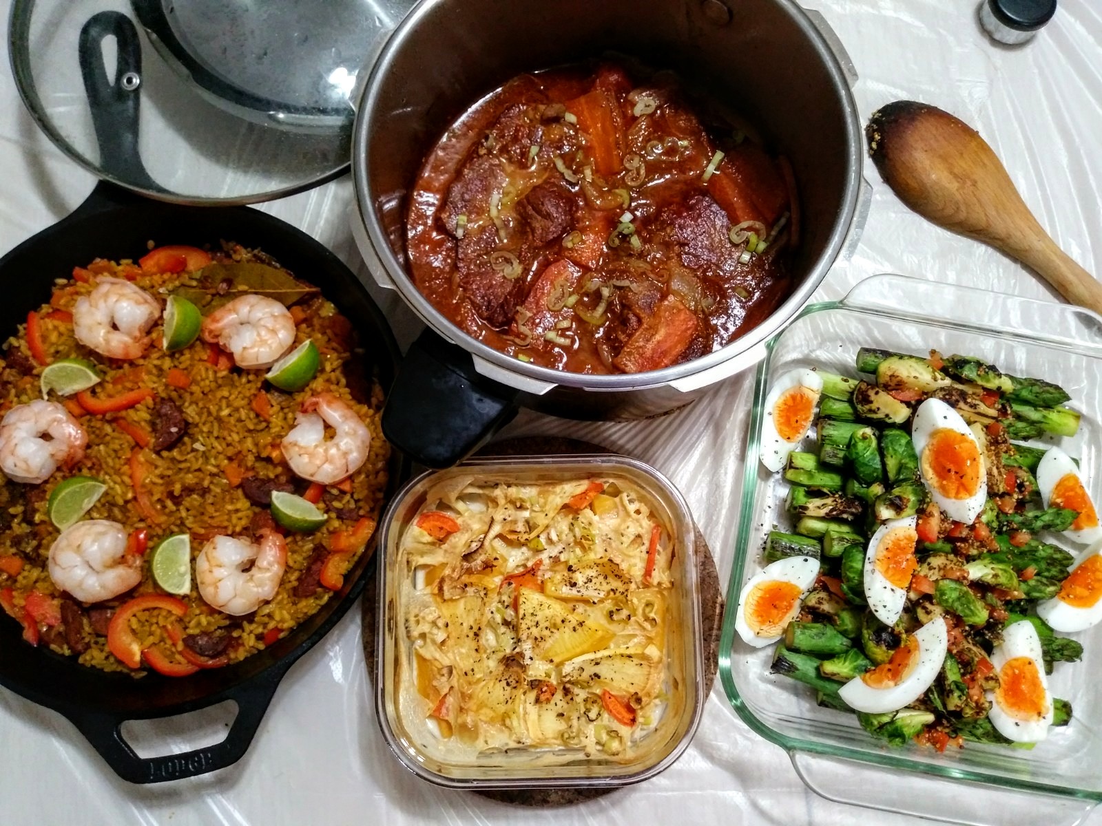 Shrimp & spicy chorizo paella, rutabaga & leek casserole, pressure cooked pork chop braised in a tomato-carrot-onion-caperberry sauce, and pan grilled asparagus & brussel sprouts with boiled eggs & diced red peppers