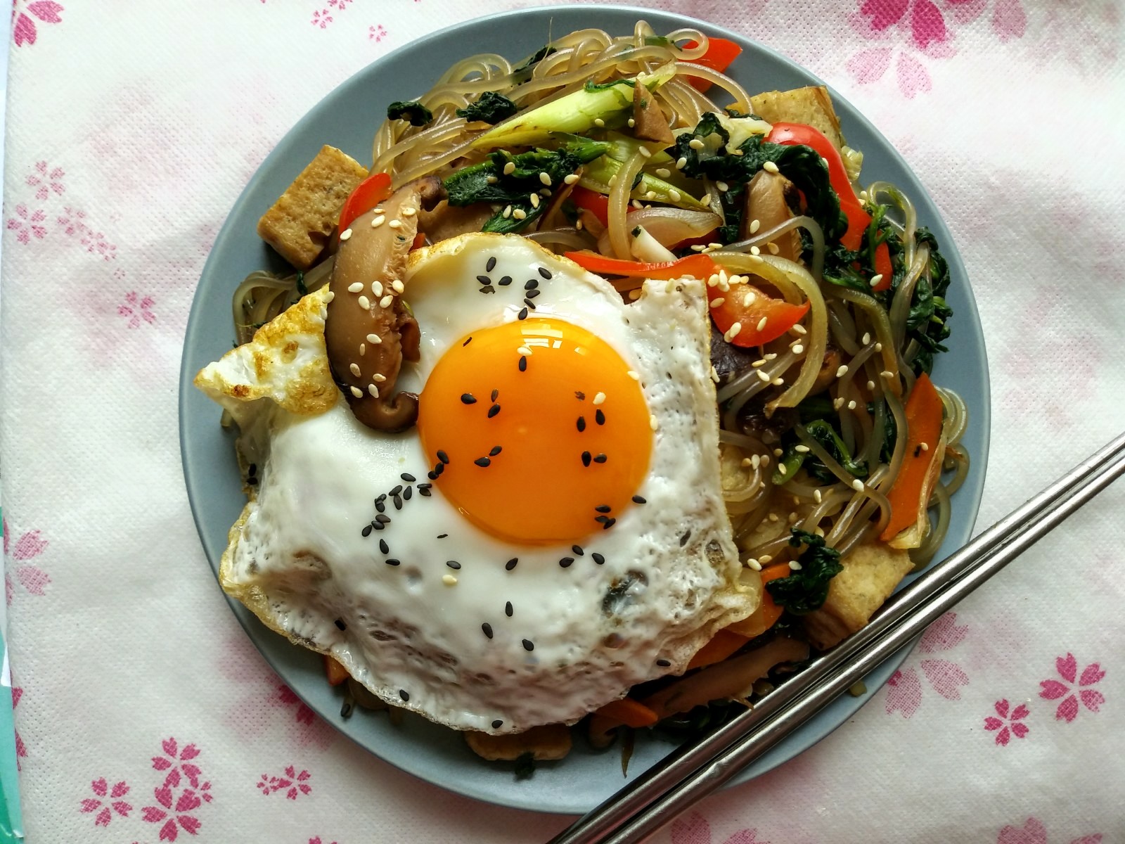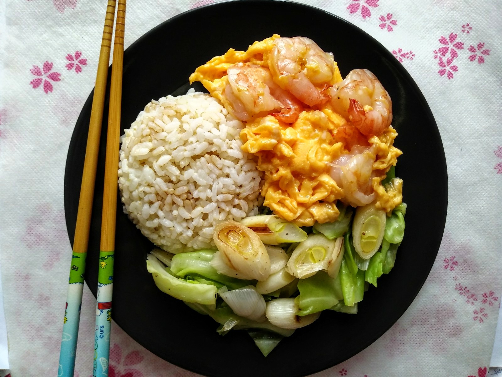 Scrambled eggs with shrimps & Stir fried leeks and cabbages with steamed rice